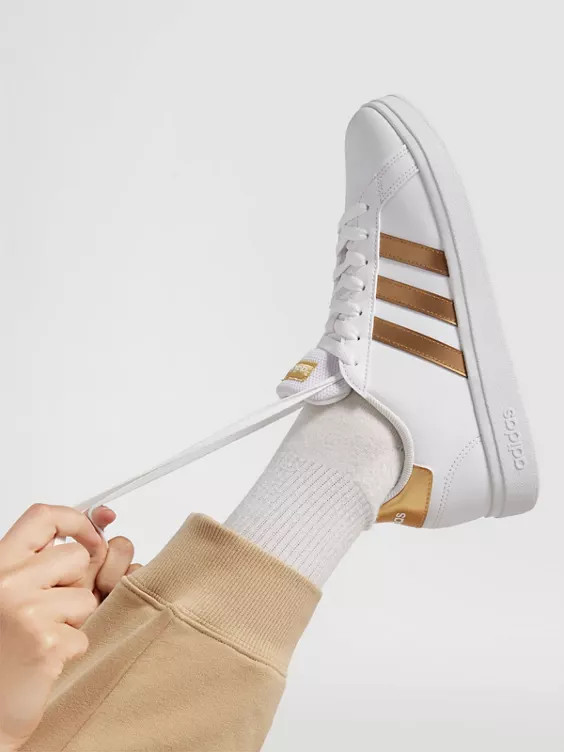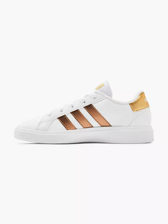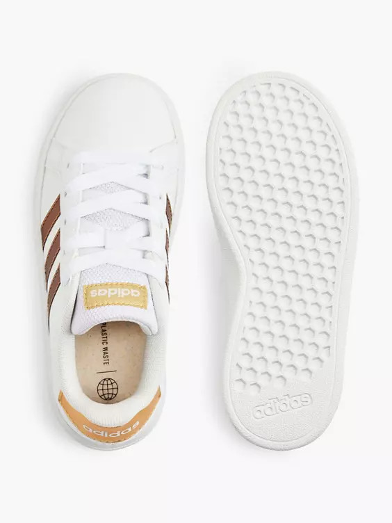 This adidas shoe for kids is sure to turn heads. The 3-Stripes, heel detail, and shiny metallic tongue label add a trendy touch to the classic court style. Cloudfoam cushioning in the midsole also guarantees ultimate comfort with every step. The upper contains at least 50% recycled material.