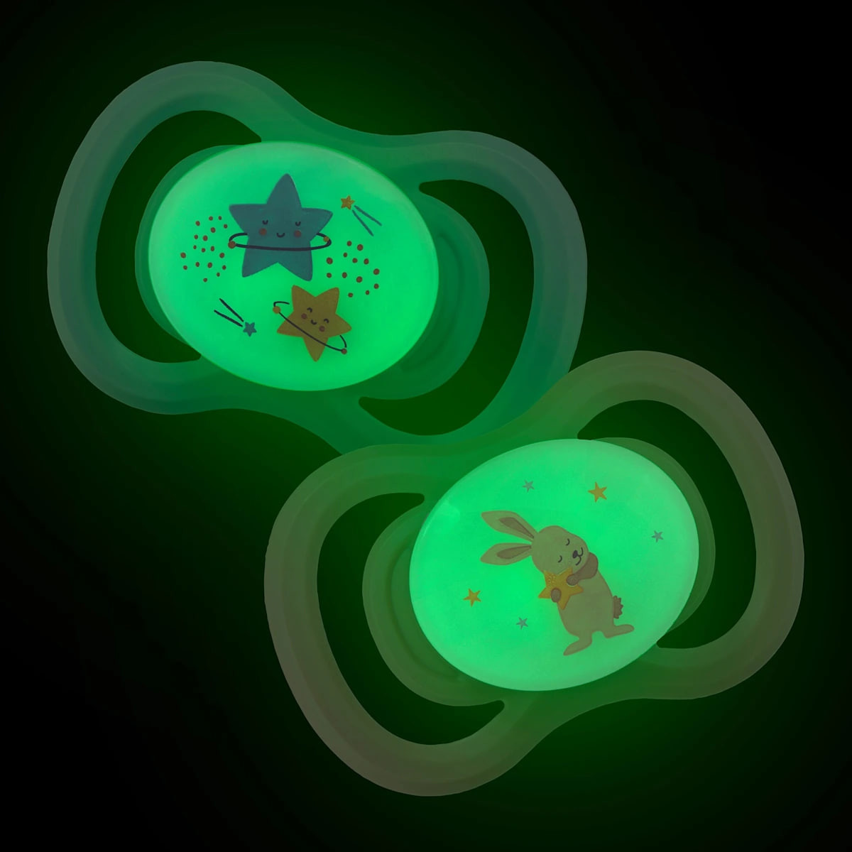 The blue/pink symmetrical Air Night silicone pacifier from Babylove is a perfect choice. With its jaw-friendly, symmetrical shape, it fits perfectly in the baby's mouth—even when turned around. Extra-large air holes ensure maximum airflow, increasing comfort for the baby. A special glow-in-the-dark button makes it easier to find the pacifier at night. It also comes with a practical transport and sterilization box, ideal for microwave use and quick sterilization. Made from carefully tested materials, this pacifier ensures safety and comfort for every baby.