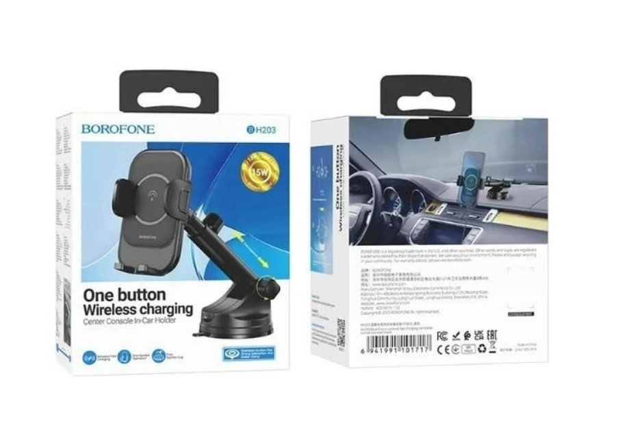 Installation location: car panel / windshieldThe black car holder BOROFONE BH203 is a universal device that allows not only to comfortably secure your mobile phone in the car, but also to power it wirelessly. The BH203 model has a charging capacity of up to 15 W and is suitable for use on the car dashboard.