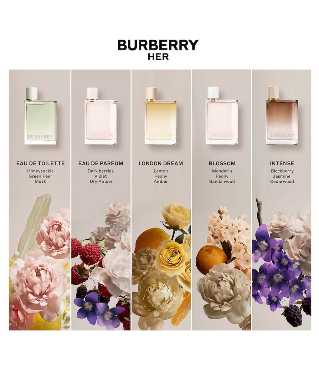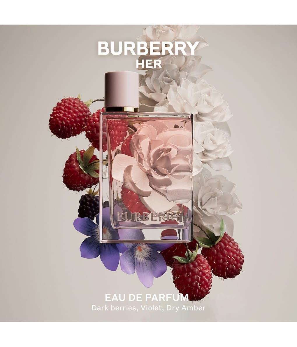 Burberry Her captures the spirit of free-spirited, independent women who live boldly and explore everything life has to offer. It is Burberry’s first fruity gourmand fragrance for women, opening with an intense burst of blackcurrant, blueberry, and raspberry. This rich fruity start melts into delicate jasmine and violet, finishing with warm, powdery base notes of amber and musk.