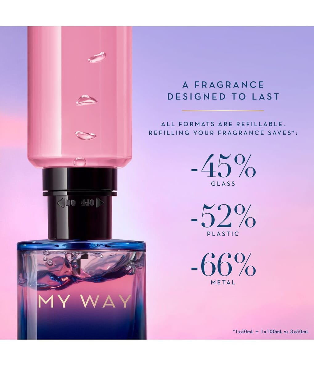 My Way Le Parfum invites you to explore new horizons and embrace your unique path in life. This refillable perfume captures a deep, independent version of femininity with its refined floral-woody composition.