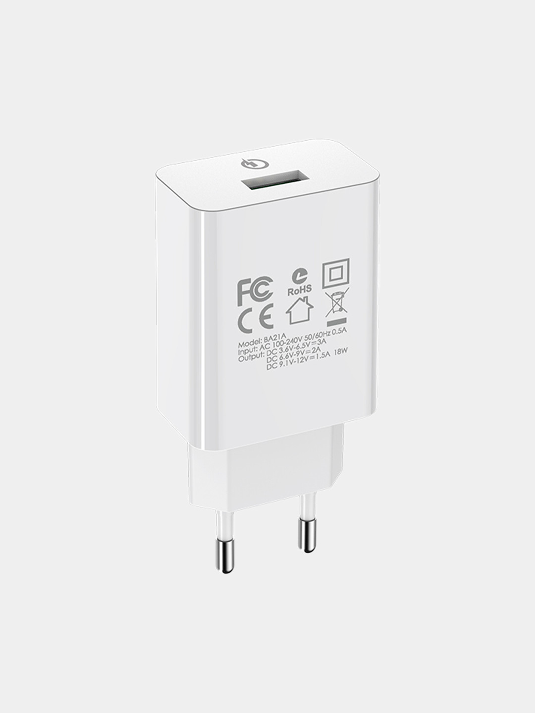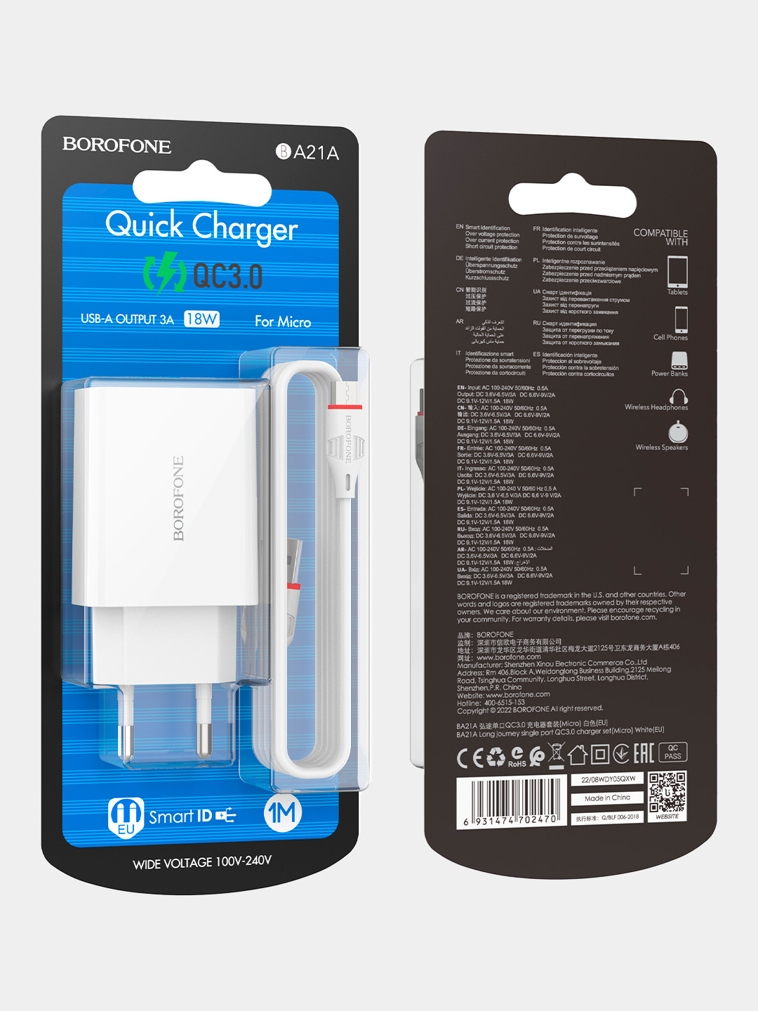 BOROFONE BA21A Long Distance Travel Single USB Wall Charger EU Plug Micro USB or USB-C Cable Kit Support QC3.0/QC2.0 FCP AFC Output Current 3A/2A/1.5A