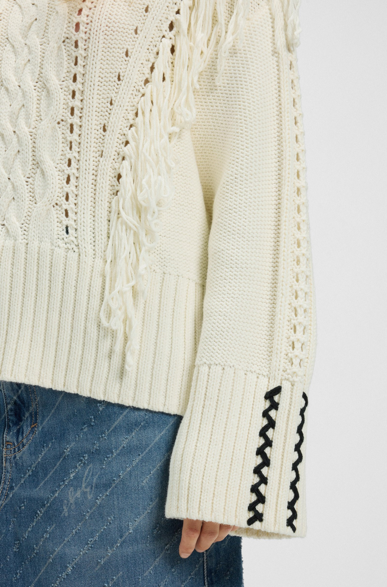 Drawing inspiration from Western styling, this cotton-blend BOSS Womenswear sweater combines classic cabling with fluid fringing. Subtle logo charm. Open-work contrast stitching. This product contains at least 60% better raw materials. This product is partly made with organic cotton. Our organic standards do not allow the use of synthetic fertilisers, pesticides or genetically modified seeds.