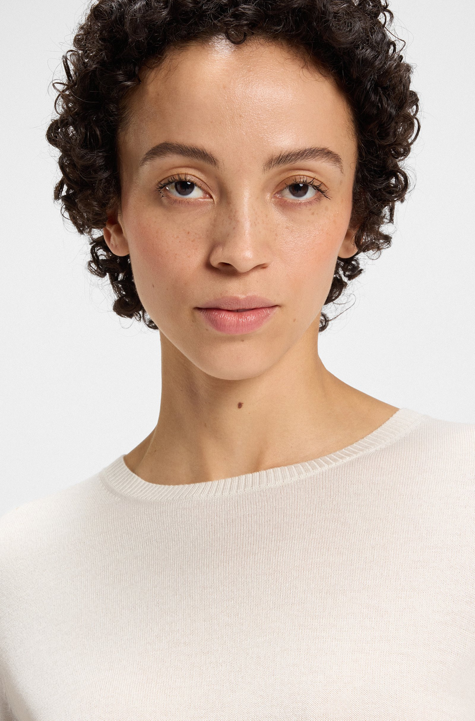 Blended with cashmere, this luxe BOSS Womenswear sweater has a light sheen and intricate open stitching at the back. Subtle embroidered logo. Ottoman-structured hem. This product is made with cellulose fibres, derived from natural raw wood material and sourced from responsibly managed forests. We cooperate with external organisations to ensure respectful treatment of virgin and endangered forests.