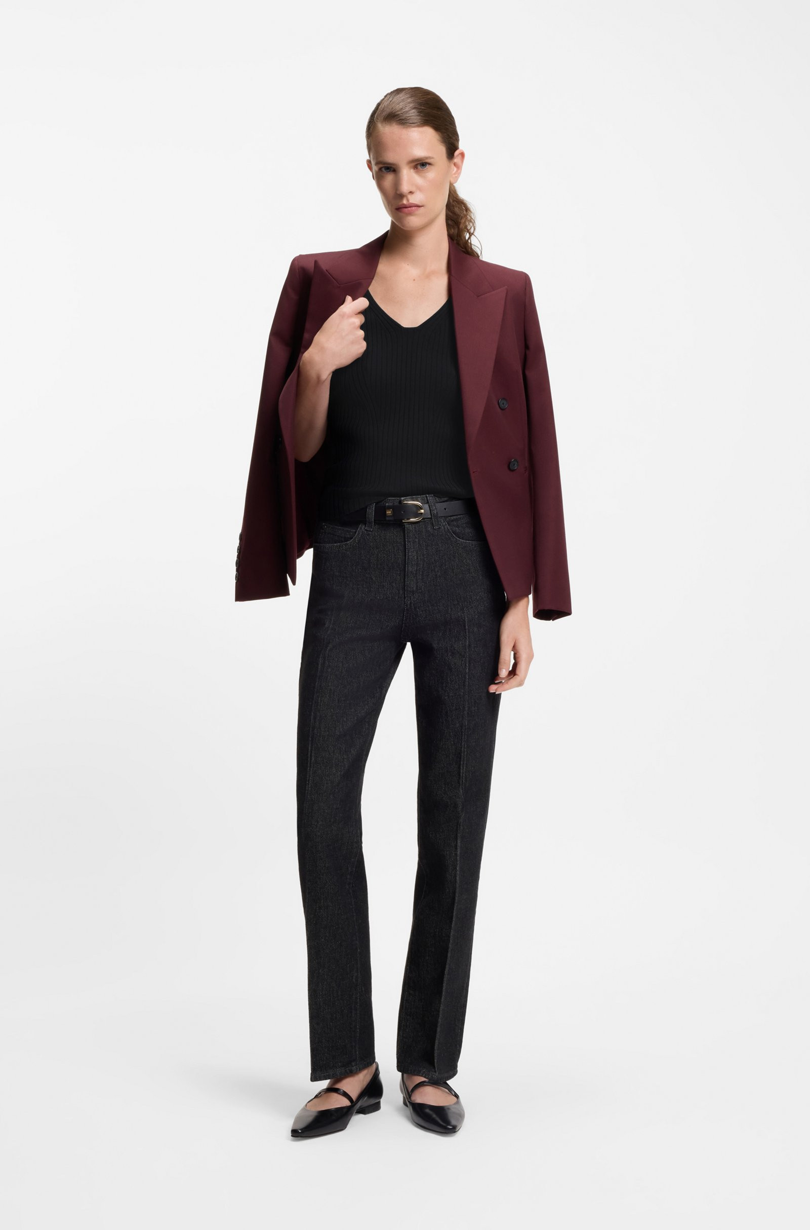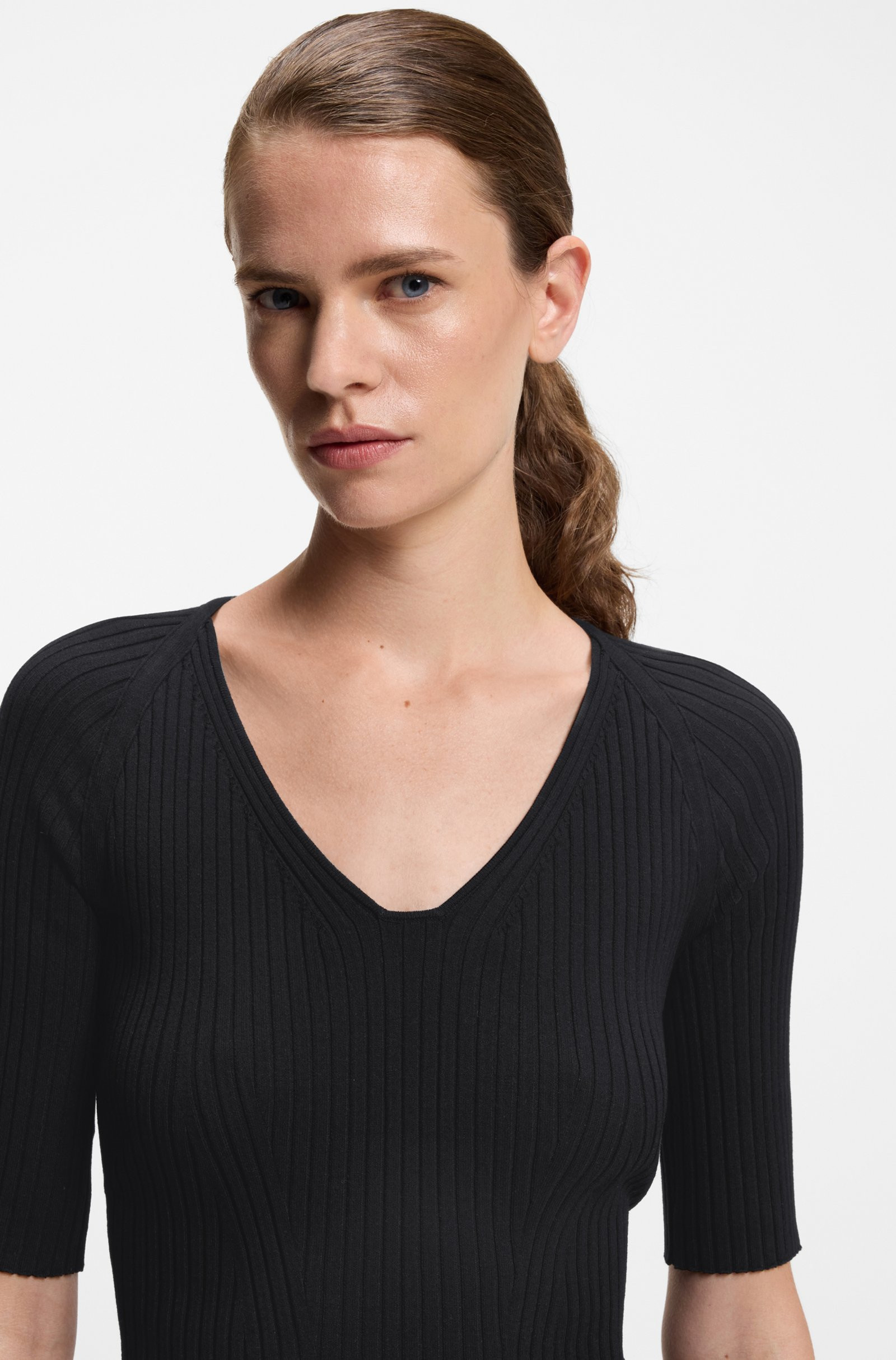 In comfortable stretch fabric with a subtle sheen, this BOSS Womenswear knit T-shirt has tonal button trims for an elegant touch. Machine washable.