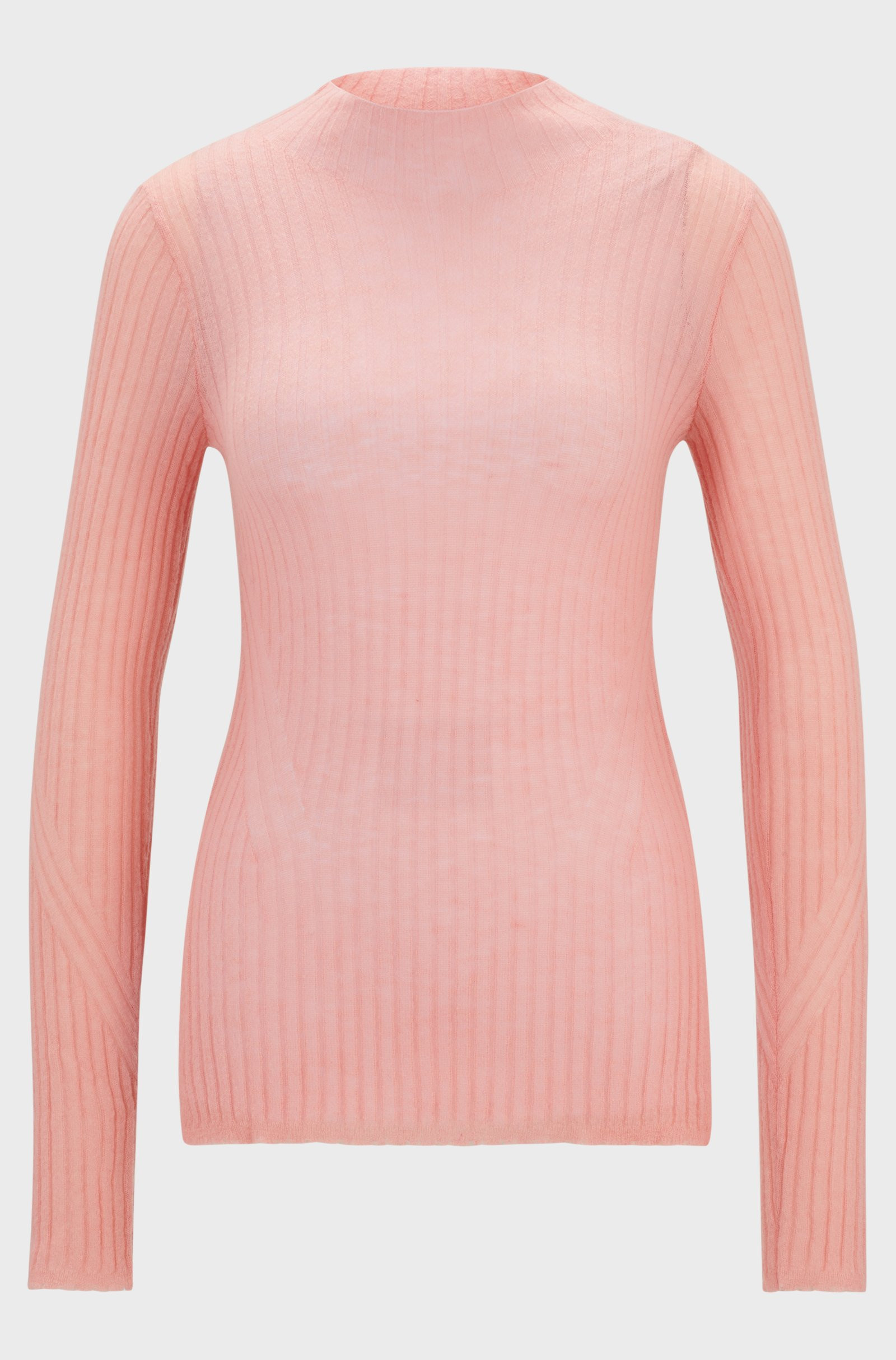 A feminine sweater with a ribbed structure by BOSS Womenswear. Crafted in a soft blend, this piece features side slits and a high neckline. This product is made with responsibly sourced wool. For us, responsibly sourced means mulesing free, and meeting the standards of the Five Freedoms of animal welfare.