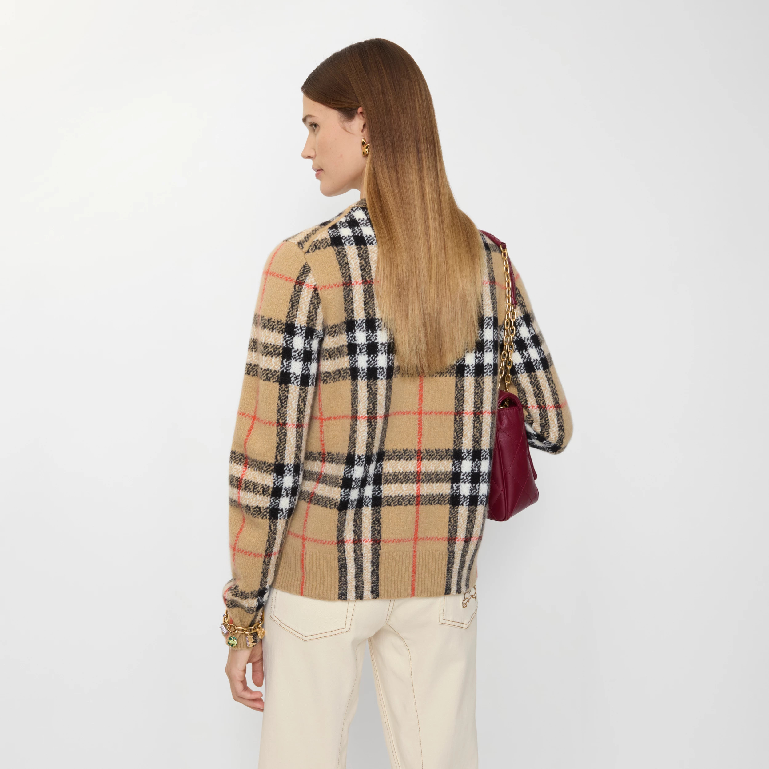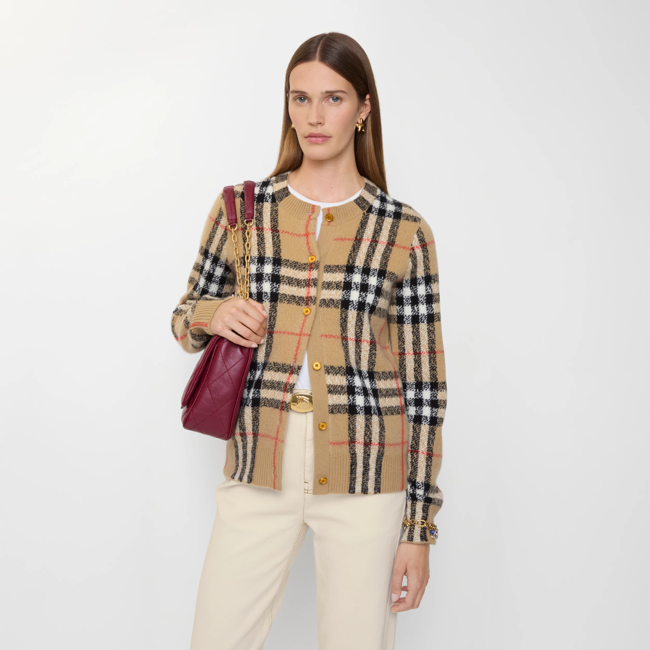 • A crew-neck cardigan in double-faced cashmere wool, jacquard-knitted with the Burberry Check. The design is cut for a regular fit and finished with logo-engraved metal buttons with an antique finish.