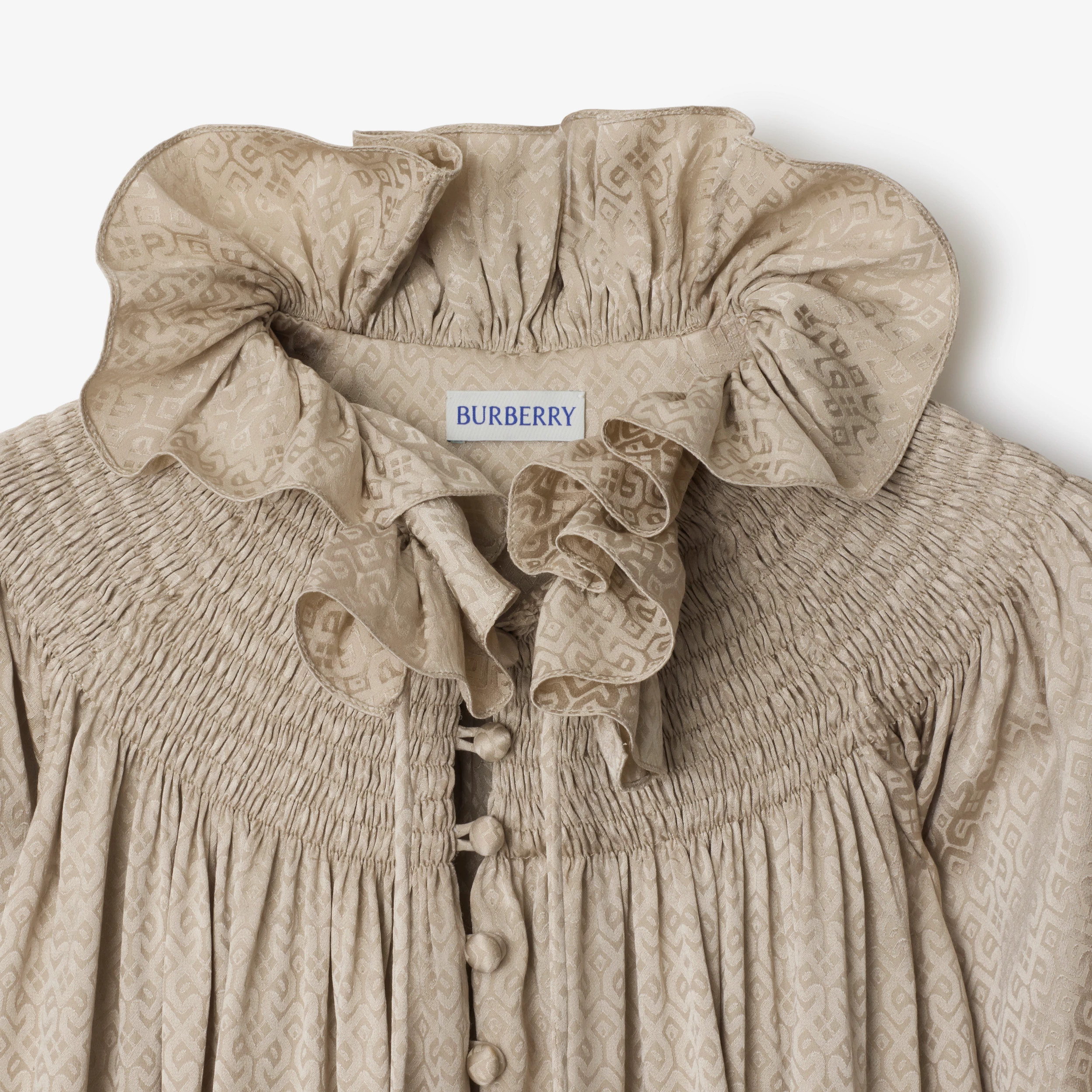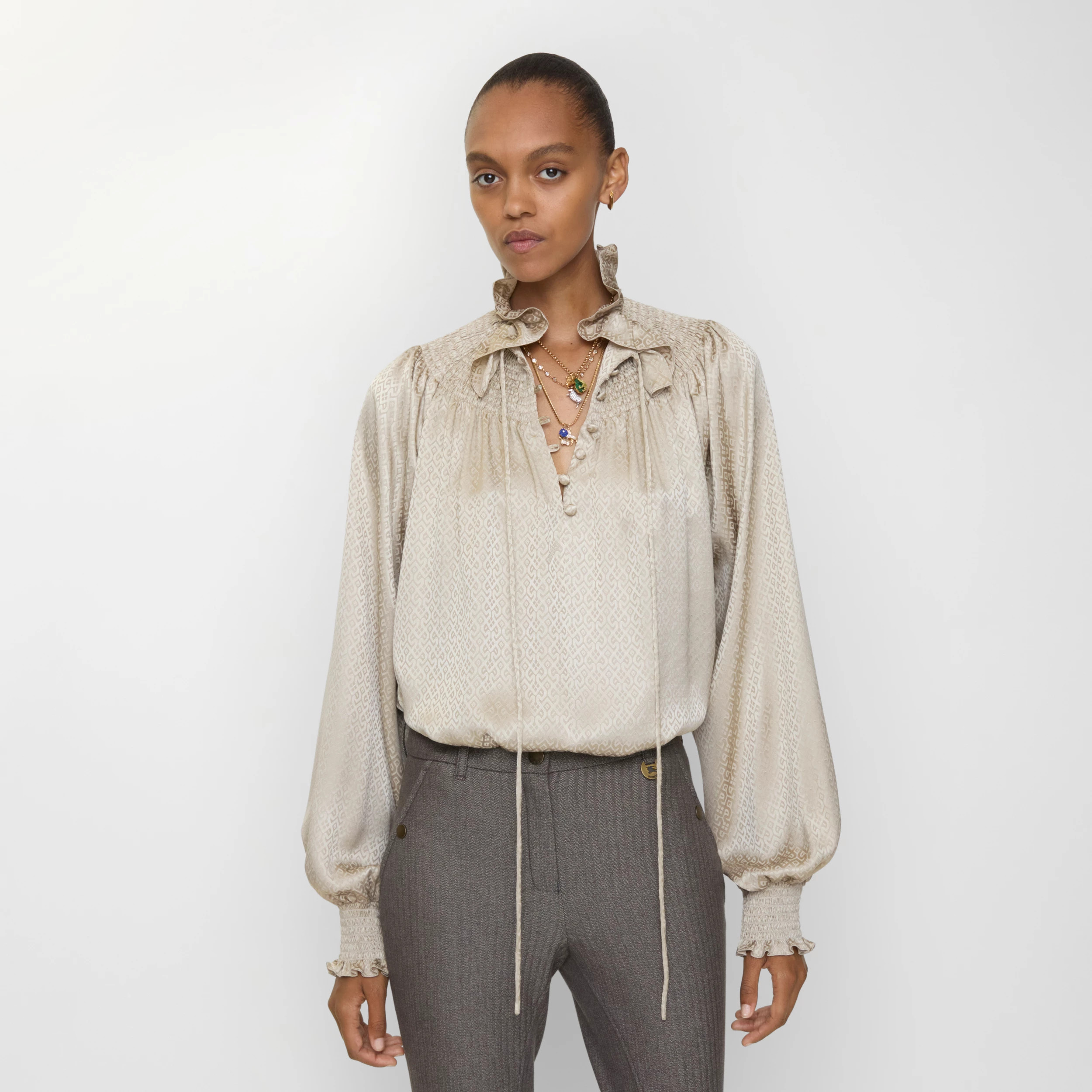 • A blouse made in Italy from silk crepe de chine, jacquard-woven with a geometric design inspired by wallpapers found in British stately homes​.​ Cut to a relaxed fit with smocking and ruffles to shape the neckline and cuffs.