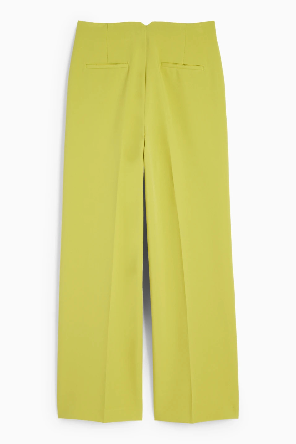 Business trousers made of woven fabric. Creases and two side pockets and two mock back pockets.