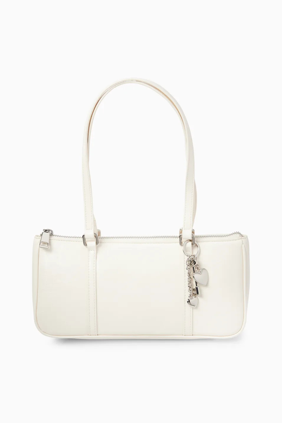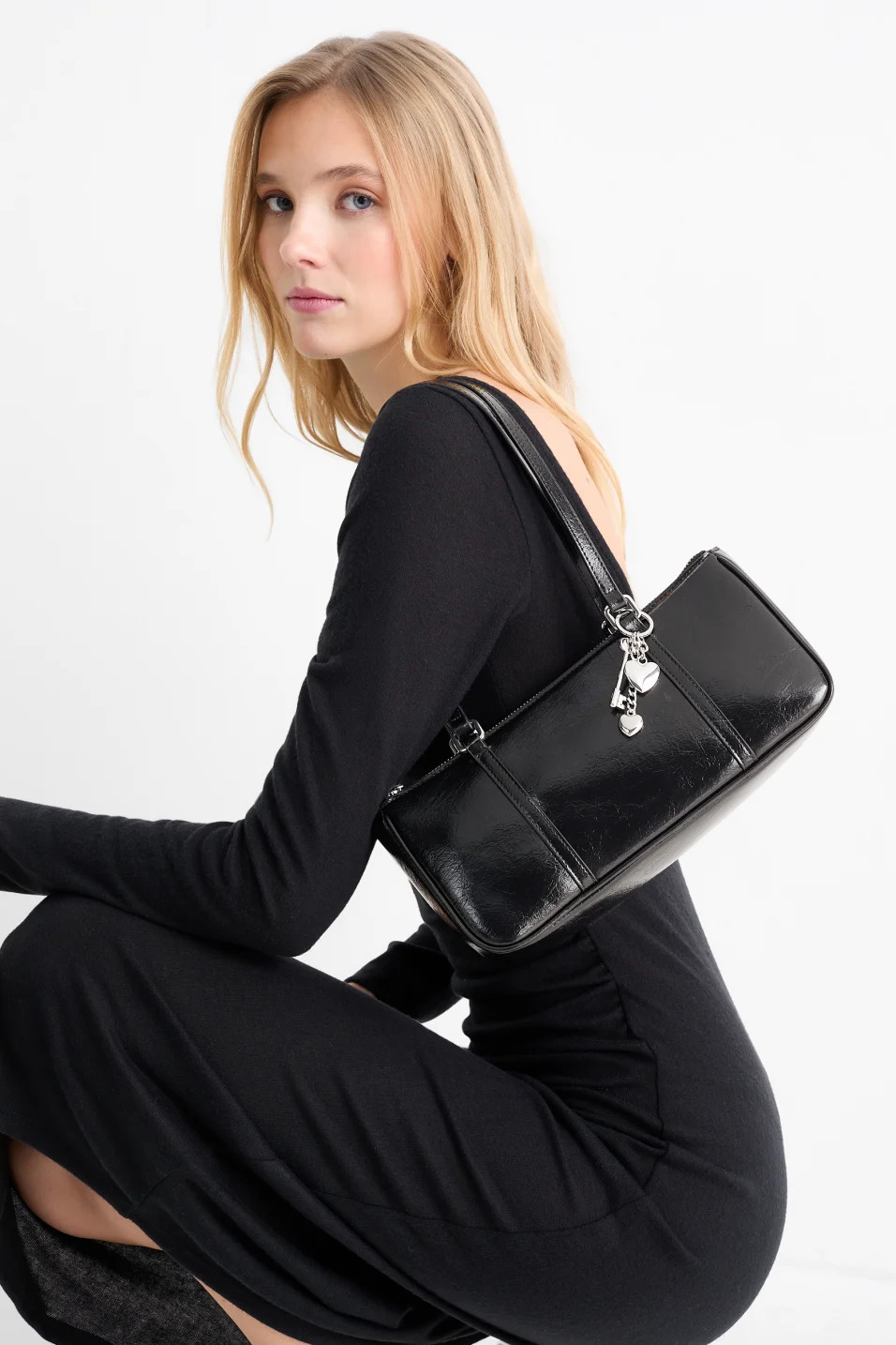Shoulder bag made of grained faux leather with a patent finish. Main compartment with zipper closure, lightweight woven lining, and a small zippered pocket. Detachable key ring with various metal charms.