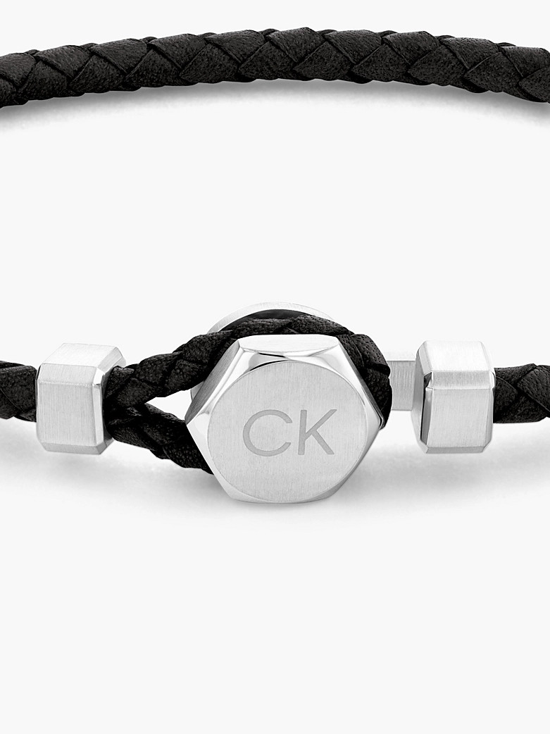 This braided leather and stainless steel bracelet features a geometric screw-shaped metal detail for a practical look.