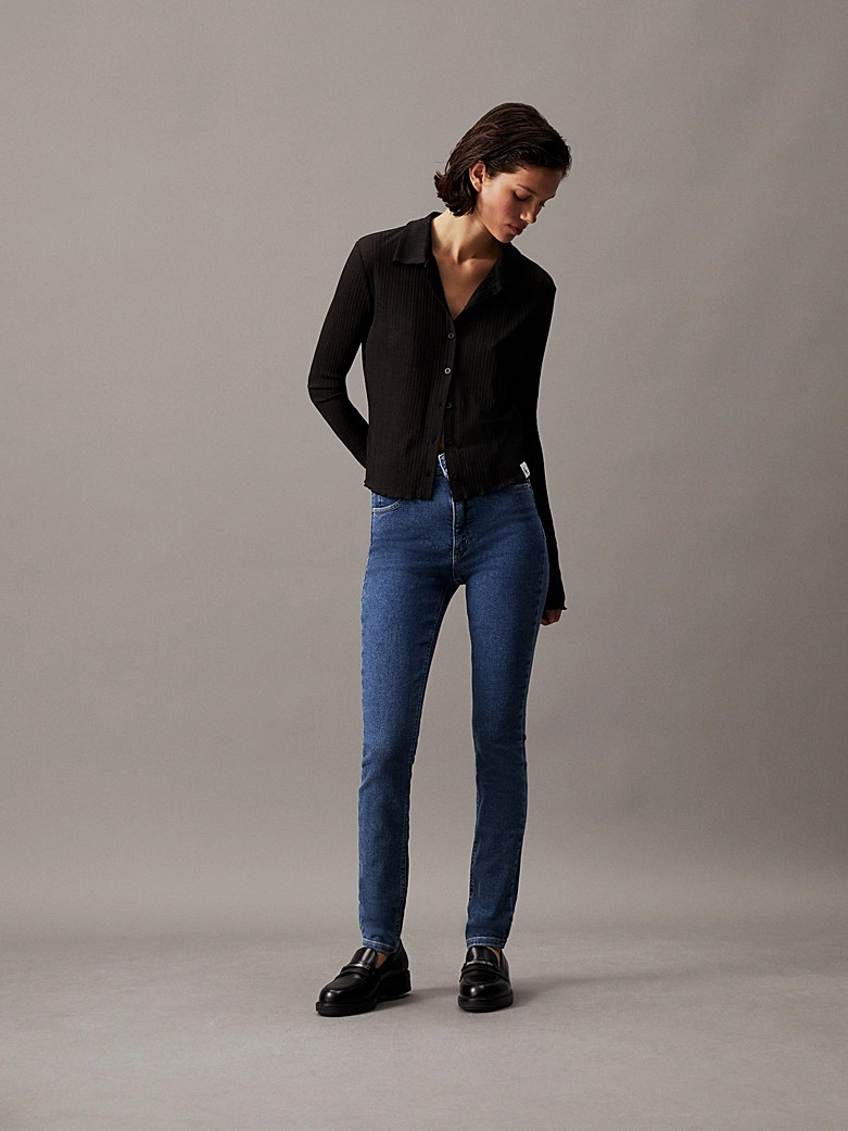 Our high-waisted jeans with a defined waist and a slim silhouette that visually lengthens the leg.