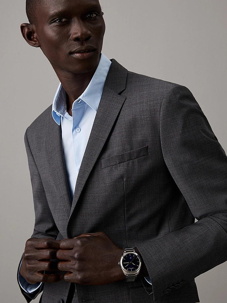 An architectural, structured case on an integrated H-link bracelet. Featuring a multifunction dial displaying the date and day of the week.