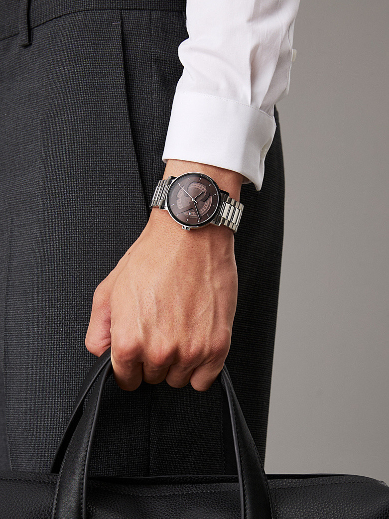 Movement-driven. This automatic watch features a beautiful exhibition case back with an exposed battery-free movement, enhanced by the skeleton dial. Available on a link bracelet.