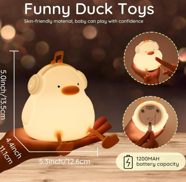 DESIGN FEATURES: Adorable duck-shaped night light with headphones design, made from soft silicone material for a gentle, soothing glow