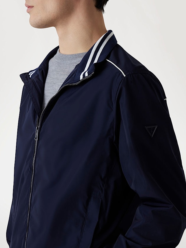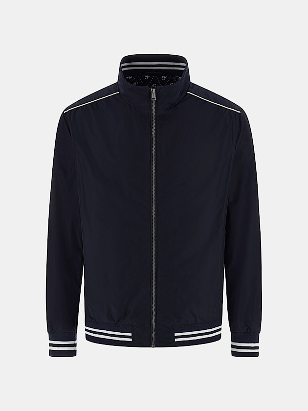 Features contrast trim on the shoulders, sleeves, and back yoke, as well as striped ribbing on cuffs, hem, and the inside of the stand-up collar.