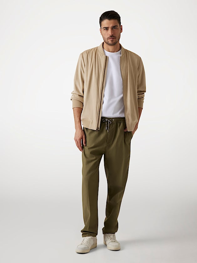 Features ribbed knit cuffs, hem, and bomber-style collar.