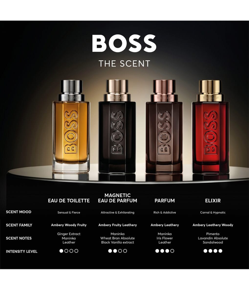BOSS The Scent for Him is an iconic eau de toilette capturing the powerful, unmistakable chemistry of a power couple. This amber-woody-fruity fragrance opens with spicy freshness of natural ginger oil, blending with the sweet, addictive Maninka fruit exclusive to BOSS. The scent is deepened by warm, sensual leather accords, leaving a captivating embrace. Presented in a refillable bottle featuring the BOSS logo and double-B monogram, it symbolizes strength and attraction.