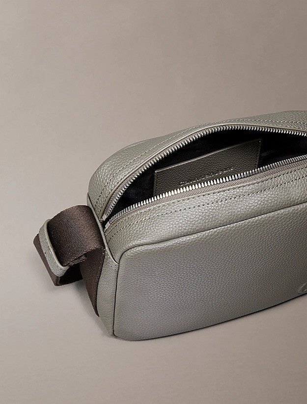 Minimalist and modern crossbody camera bag crafted from soft, grained faux leather. Features a Jacquard logo strap, adjustable length, and a matching CK monogram on the front.