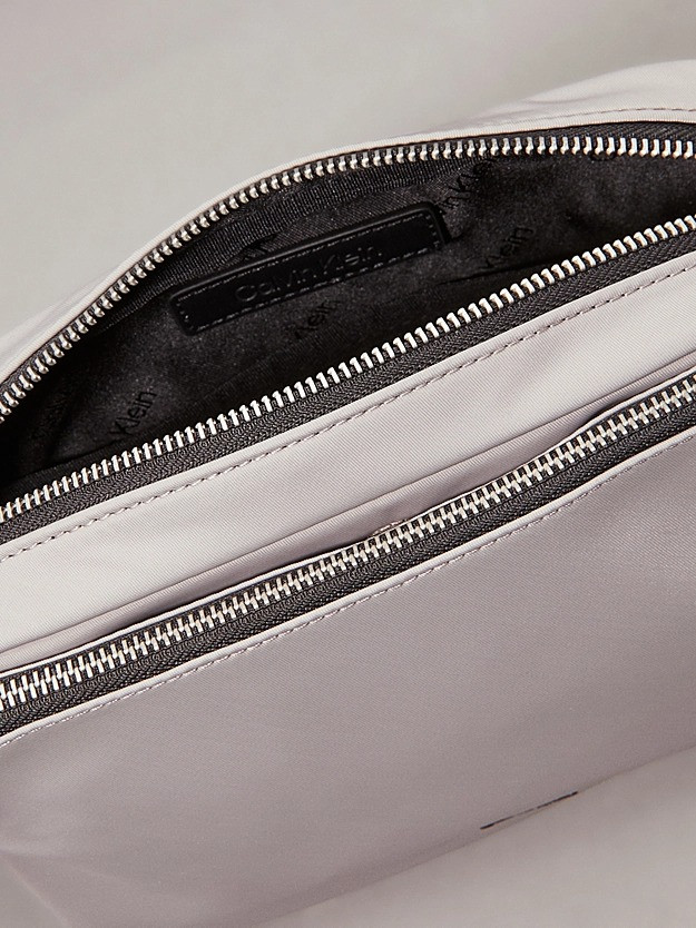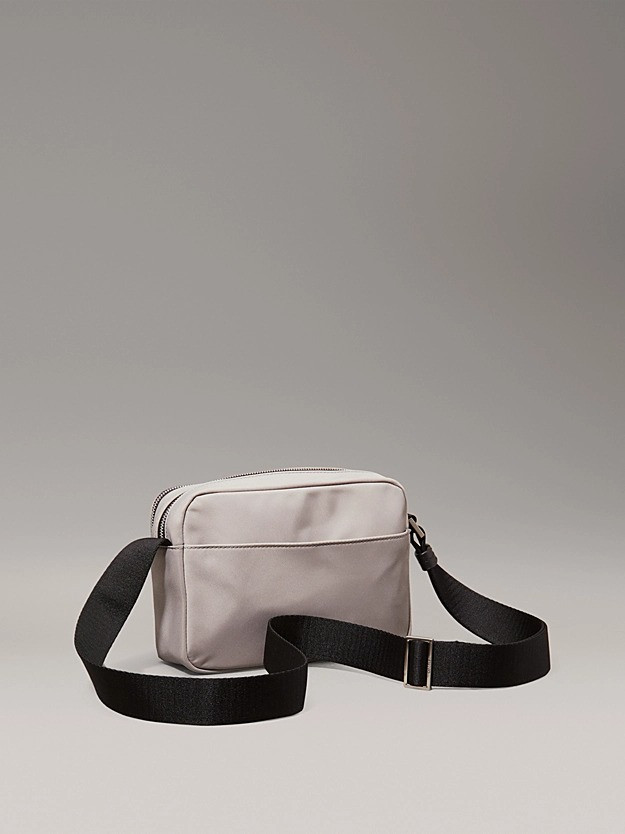 This Calvin Klein men's Crossbody Camera Bag is crafted from 59% recycled REPREVE® polyester, a durable soft fiber made from certified recycled plastic bottles. The design includes a faux leather trim, an adjustable shoulder strap (length: 29 cm – 65 cm), a zippered main compartment, magnetic and zip front pockets, an exterior slip pocket at the back, and an interior slip pocket. Features the Calvin Klein minimal metal logo on the front.