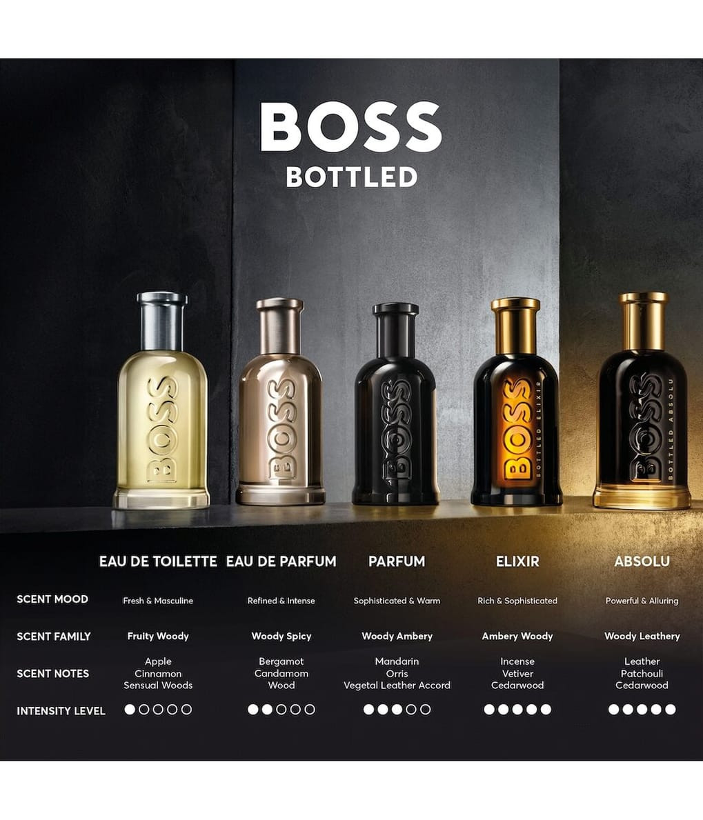 BOSS BOTTLED is one of the greatest success stories in the men's fragrance market. Ranked among the top 10 worldwide and consistently number 1 in Germany, it has sold over 50 million bottles. This scent radiates success with its unique aromatic-fruity top notes, especially red apple, setting a new standard in men's fragrances and becoming a bestseller. Its timeless and distinctly masculine charisma remains unmistakable. Top notes of apple, heart notes of cinnamon, and base notes of musk define its unforgettable aroma.