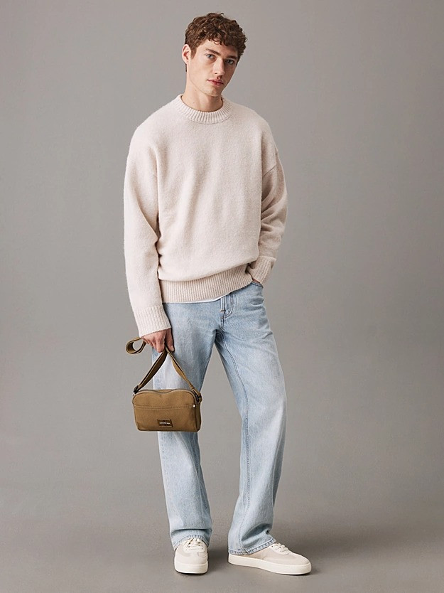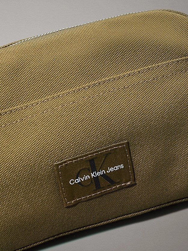 Compact crossbody bag made from 100% recycled polyester canvas (excluding trims). Features an adjustable shoulder/crossbody strap, top zip closure, front exterior pocket, and a worker-style design with a signature Calvin Klein logo patch.