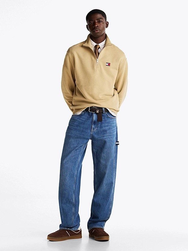 Product Description: This cotton sweatshirt features a mock-roll collar with a half-length zipper, giving it a timeless athleisure silhouette. Designed with rib-knit collar, cuffs, and hem, and finished with a Tommy Badge on the chest and Tommy Jeans branding.