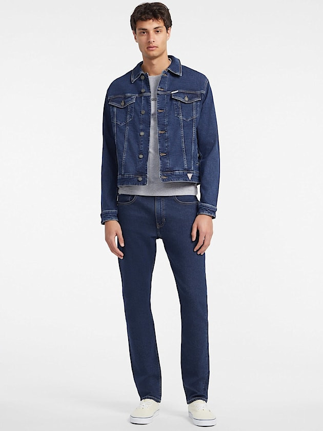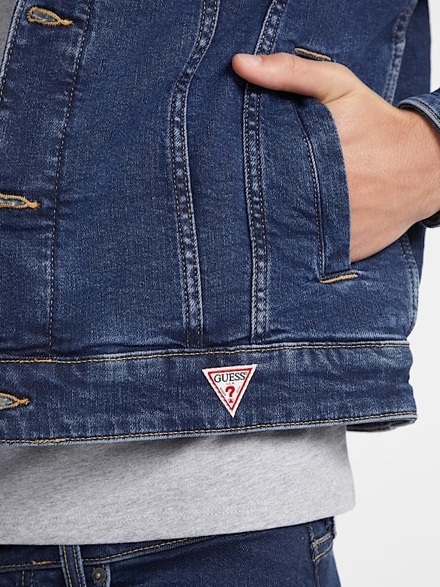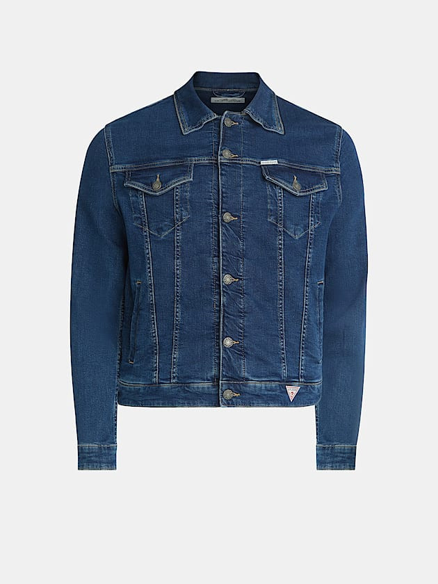 A classic slim-fit trucker jacket with button fastening, crafted from signature GUESS JEANS woven stretch denim with GUESS AIRWASH™ finish.