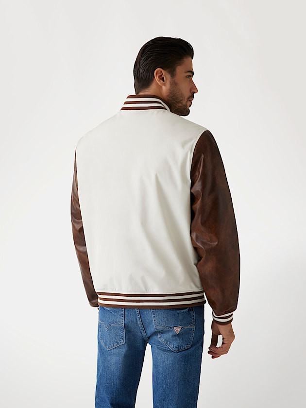 A varsity-style jacket with a twill body and contrast long sleeves.