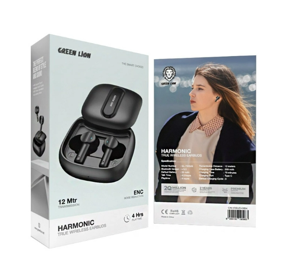 The Green Lion Harmonic True Wireless wireless headphones are designed for perfect sound thanks to the latest Bluetooth v5.3 technology and an extended transmission distance of up to 12 meters. Each earphone is equipped with a 25 mAh battery, providing up to 4.5 hours of talk time and 4 hours of continuous playback without recharging. The 200 mAh battery in the charging case provides reliable power to the headphones, and it only takes 70 minutes to fully charge. These headphones minimize background noise, providing better communication quality and immersive listening with ENC noise reduction technology, making the Green Lion Harmonic Earbud headphones a reliable choice for everyday use.
