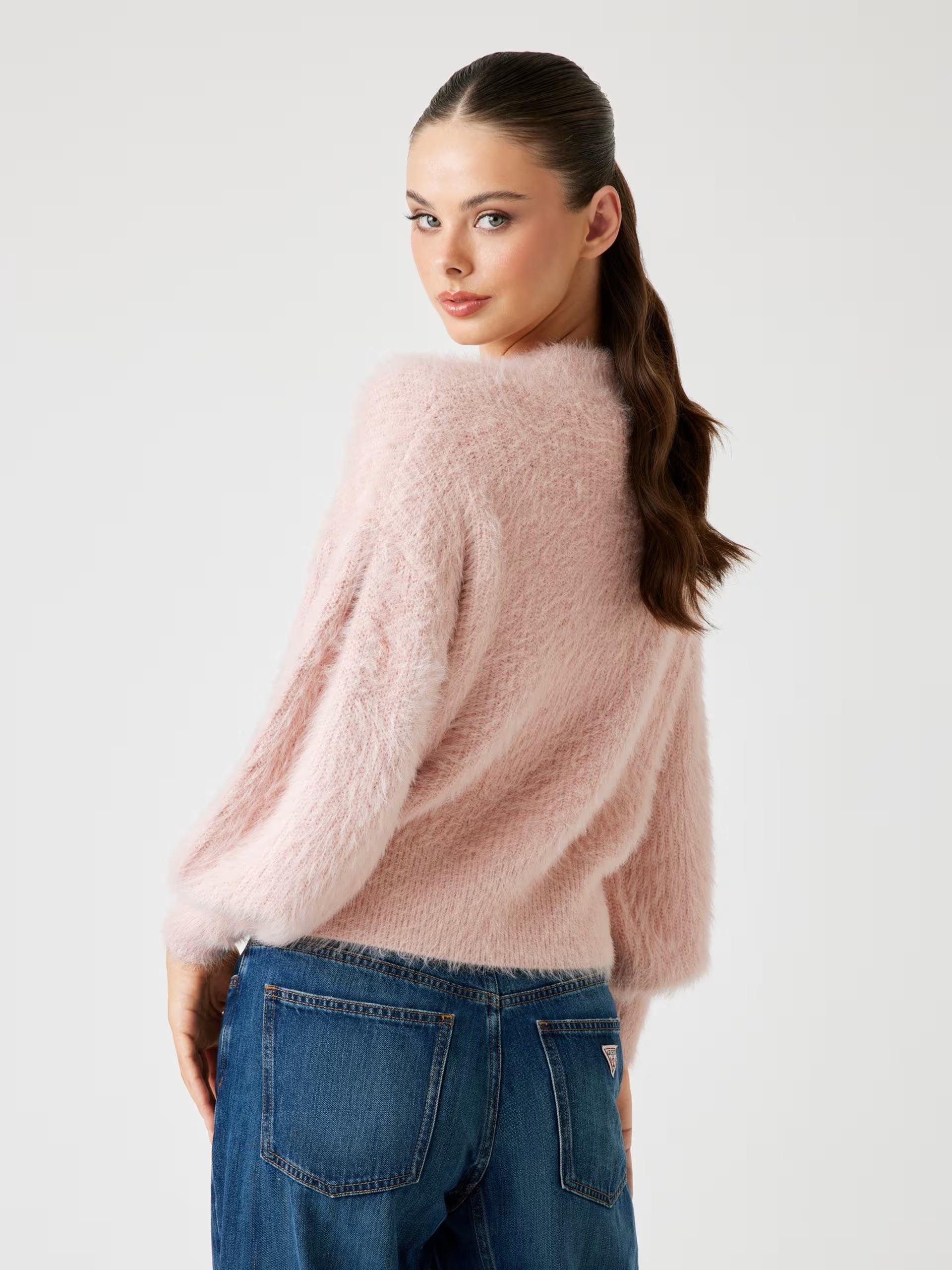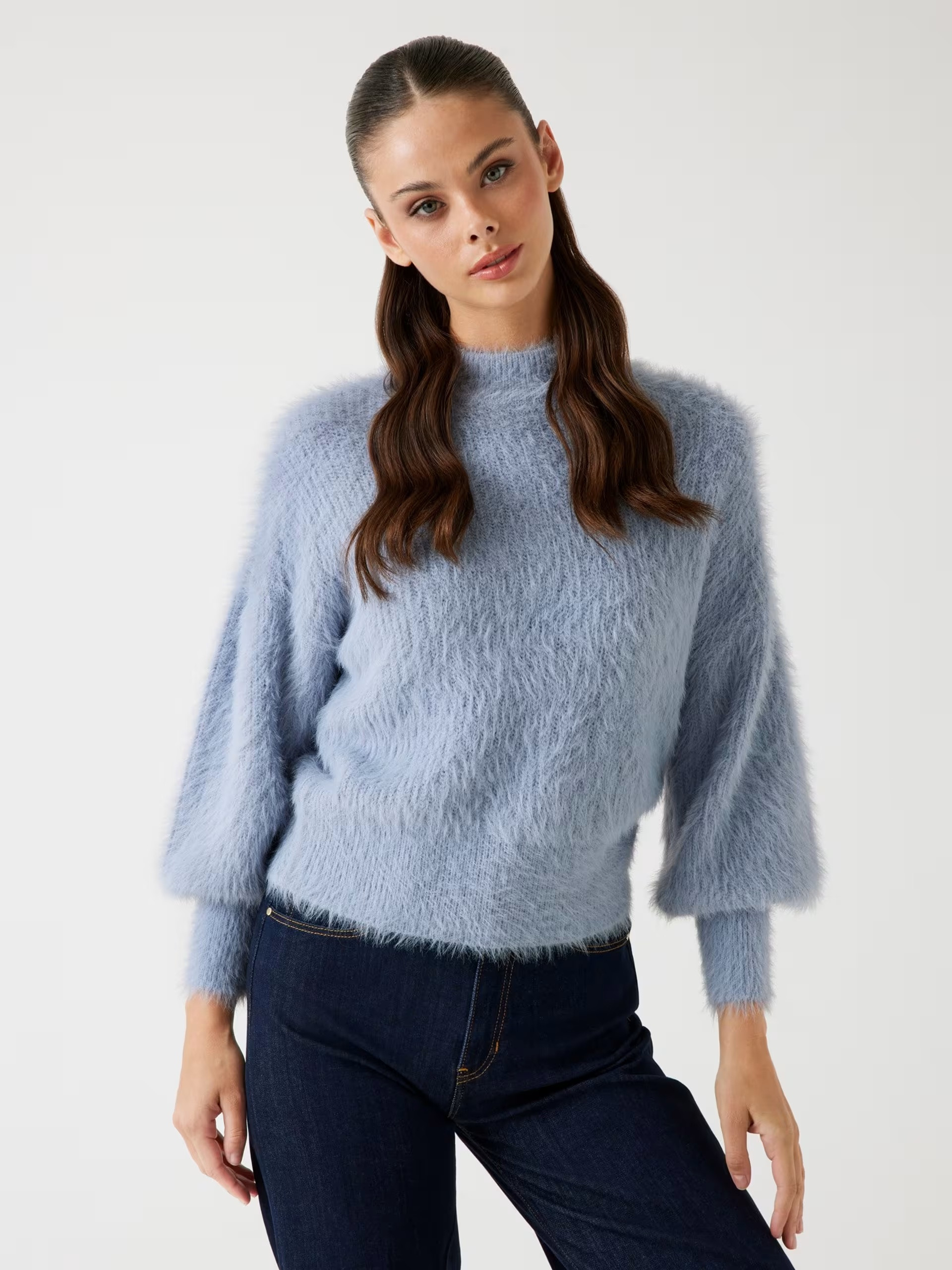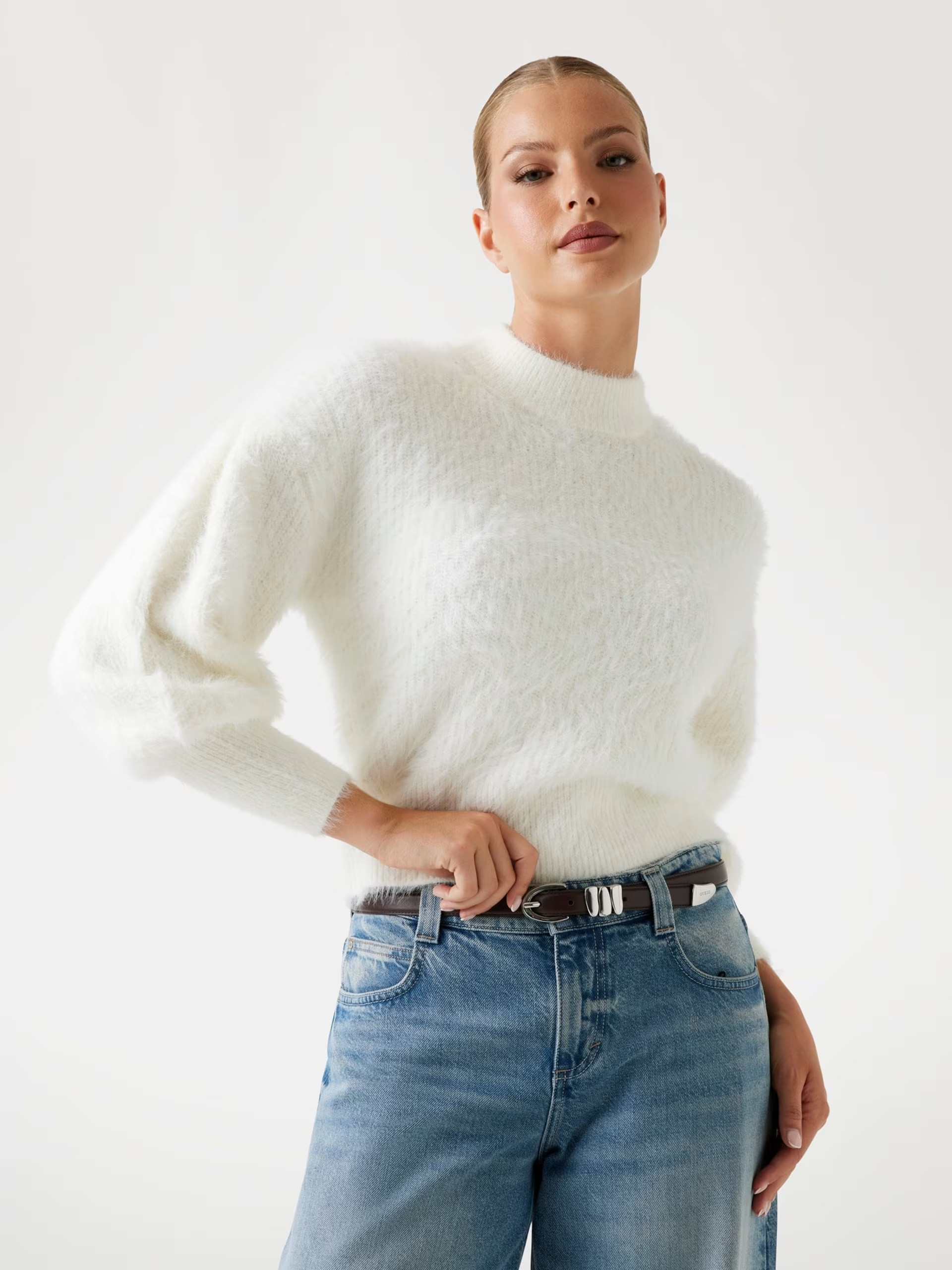 Embrace cozy elegance with this fuzzy yarn sweater. The mock turtleneck and long sleeves add a touch of sophistication. Rib knit accents create a relaxed fit for everyday style. Perfect for layering, it seamlessly transitions from boardroom to brunch, highlighting effortless charm.