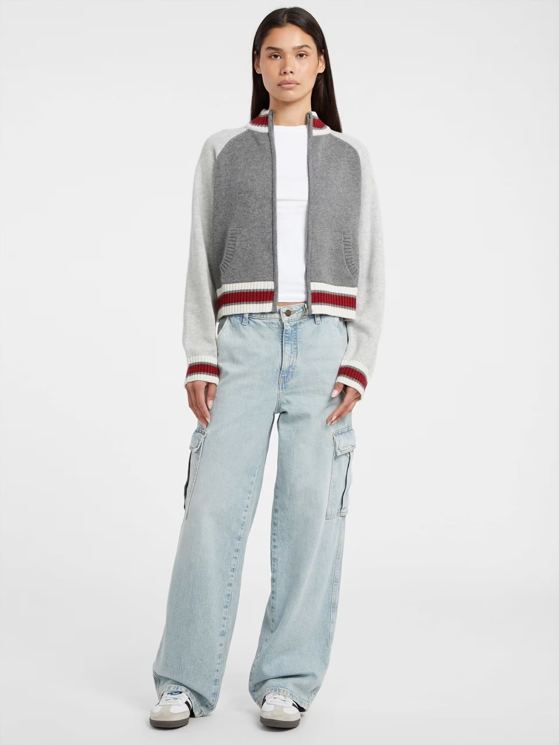 Retro flair meets modern ease. Full-zip sweater with a high neck, blending color blocks for a stylish edge. Contains organic cotton fibers