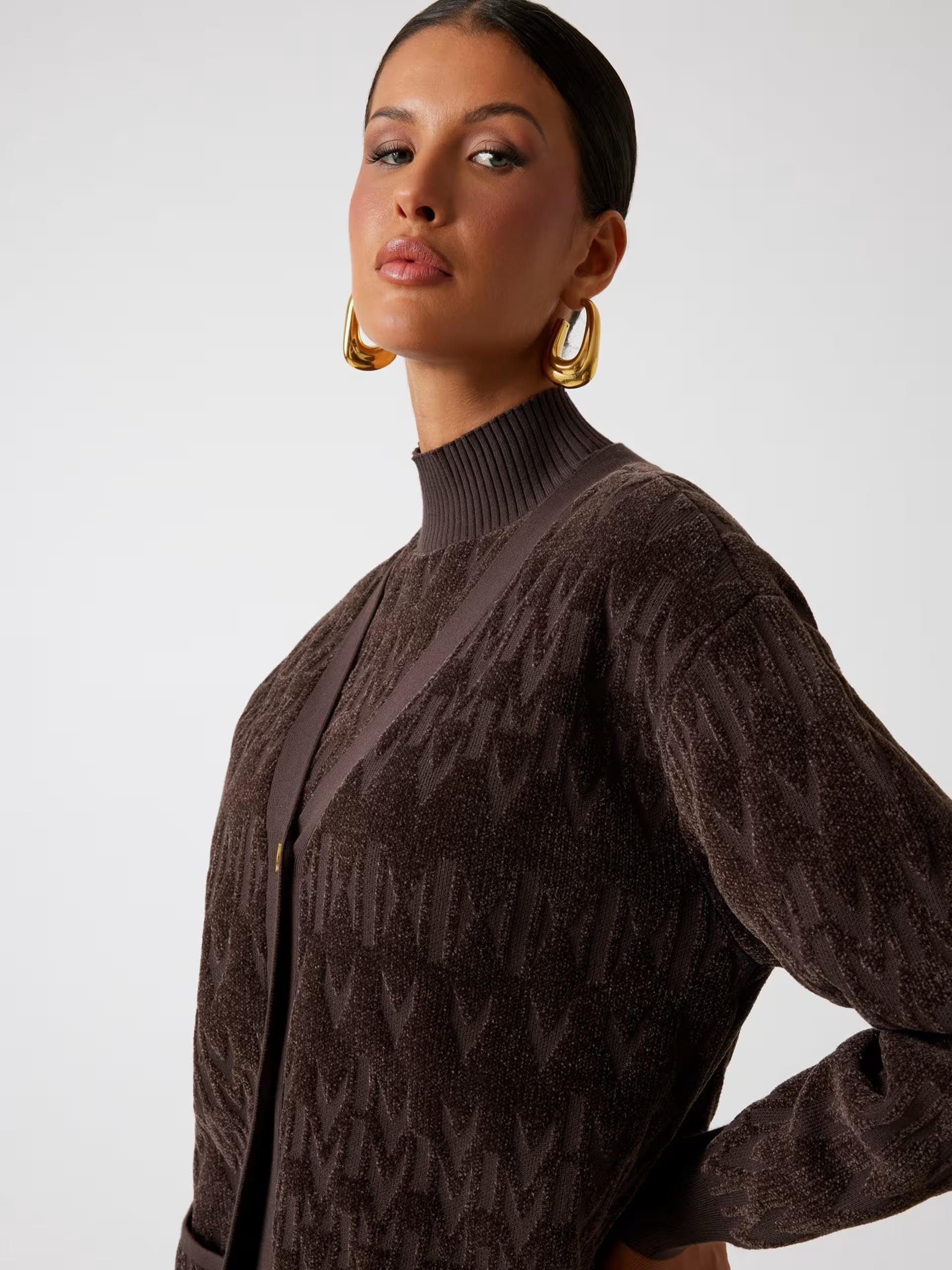 Wrap yourself in luxury with this chenille long cardigan. The all-over embossed monogram logo adds a touch of sophistication. Front patch pockets offer practical elegance. Perfect for office wear or a chic weekend ensemble.