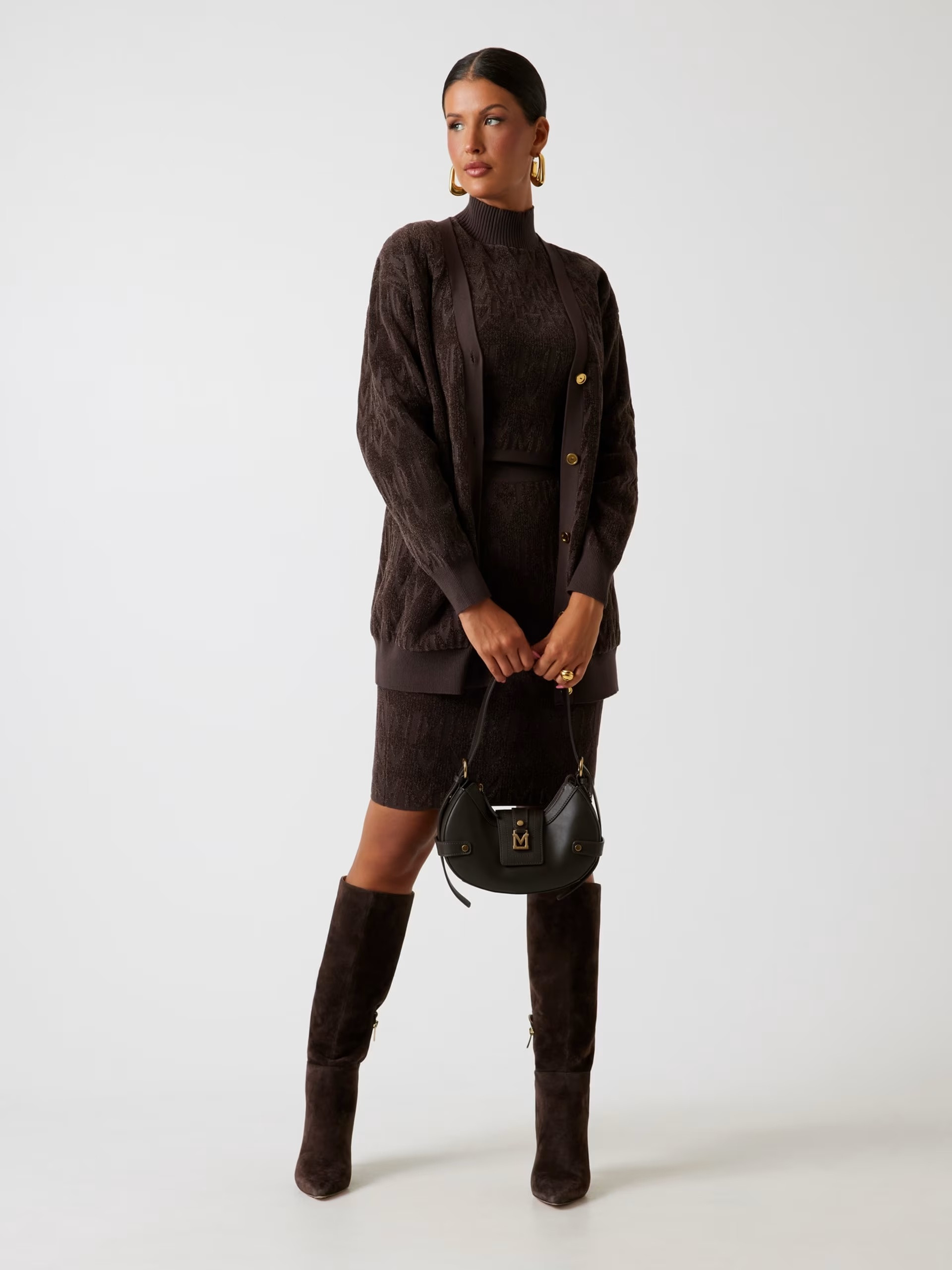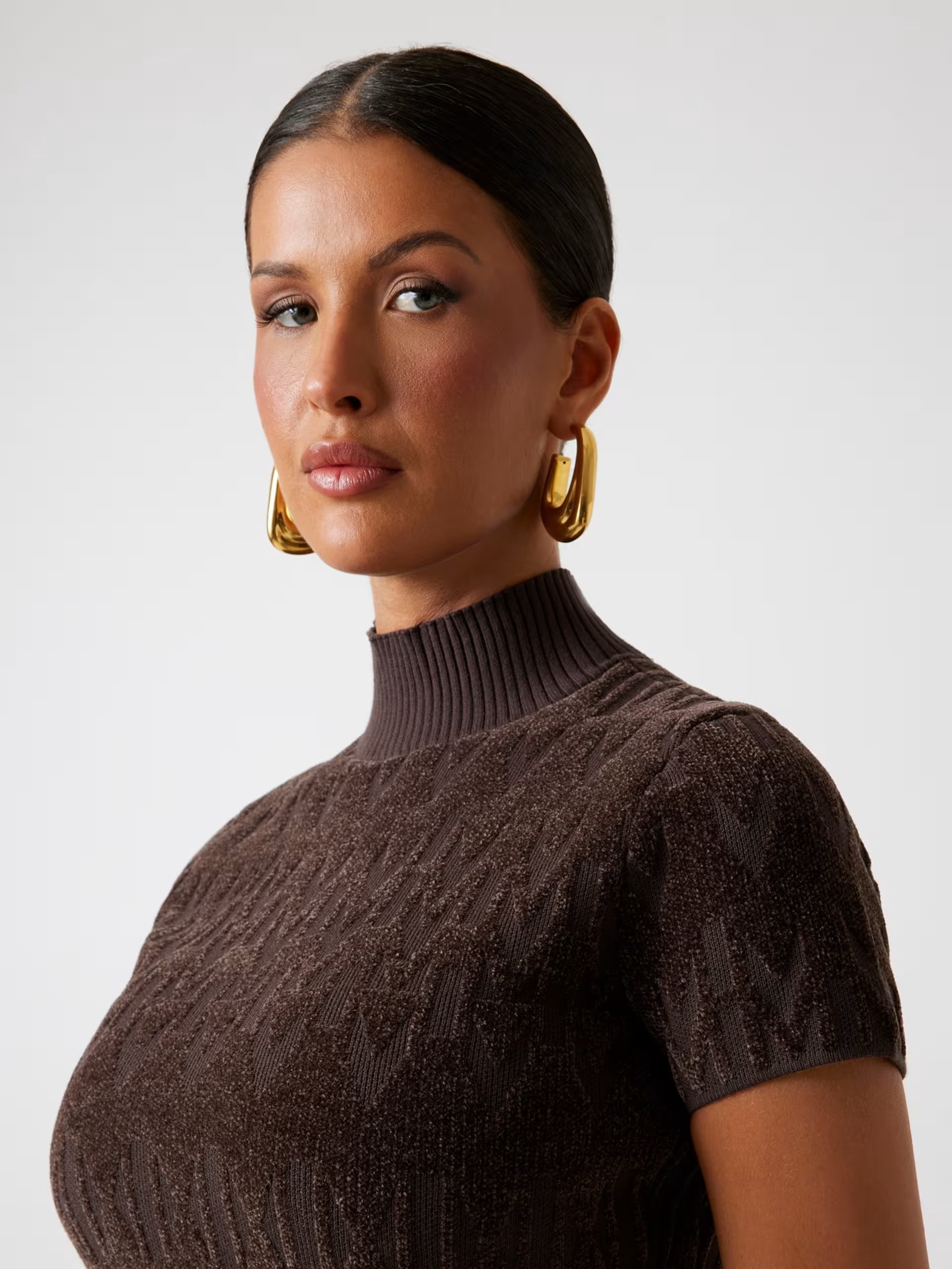 Step into sophistication with this viscose-blend chenille sweater top. The rib-knit mock neck pairs beautifully with the embossed monogram design, elegantly defining your shape. Perfect for a classic fit, this piece suits office wear or evening outings.