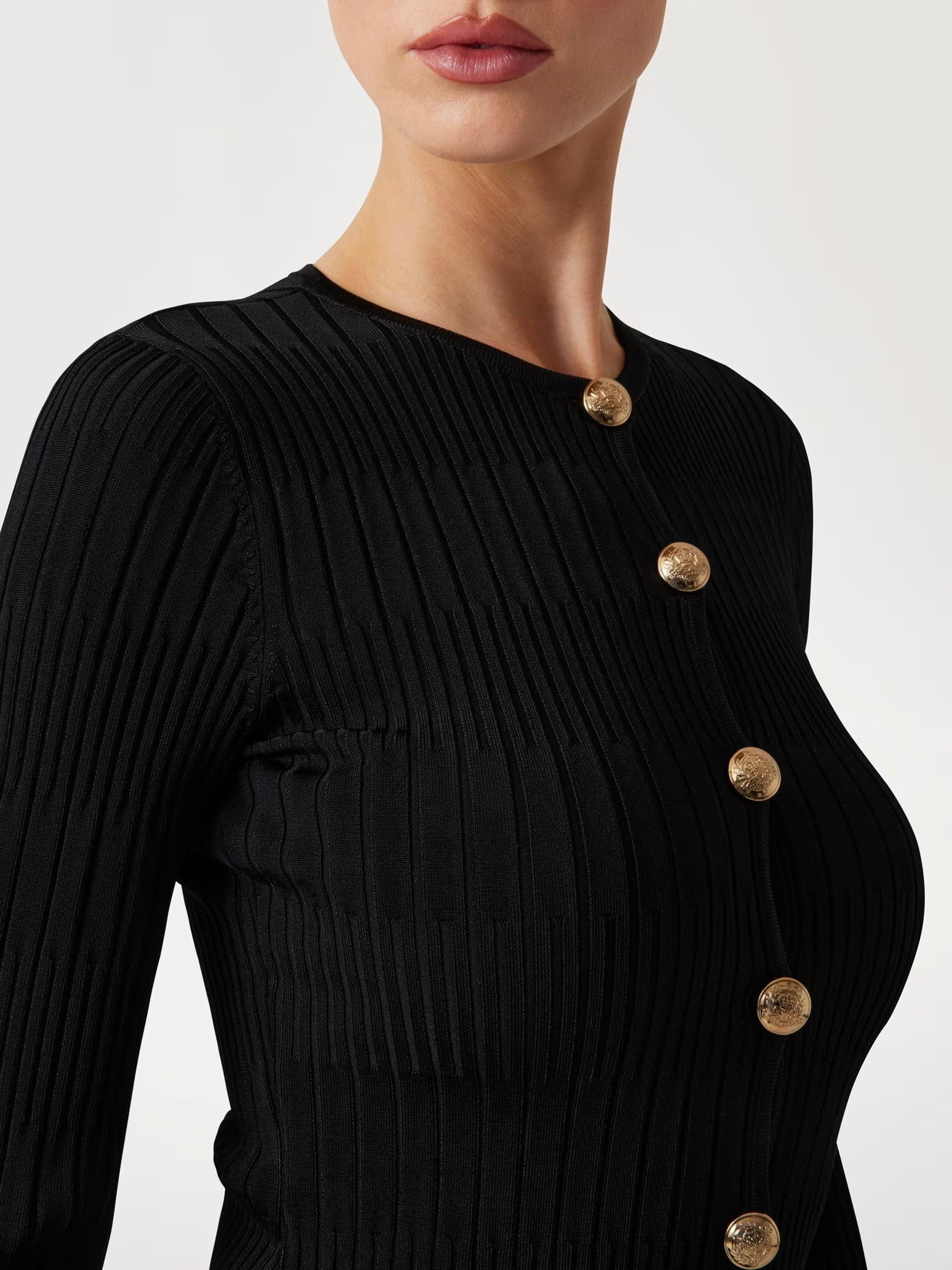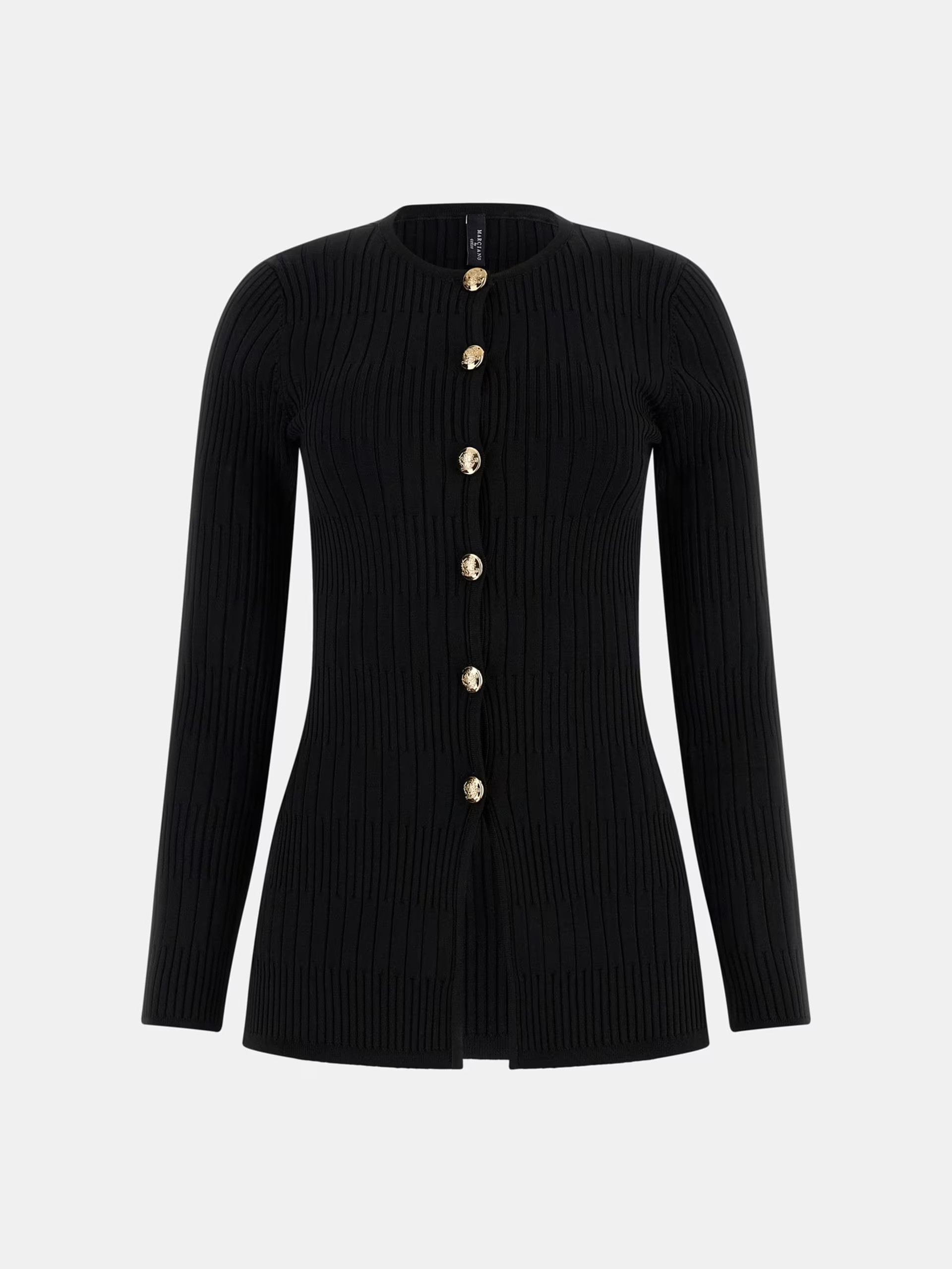 Step into sophistication with this stretch viscose-blend cardigan. The elegant vertical ribbing and polished buttons add a touch of grandeur. Ideal for office days or evening gatherings. Soft, clinging fabric elevates your attire, making it perfect for a formal occasion or a stylish affair.