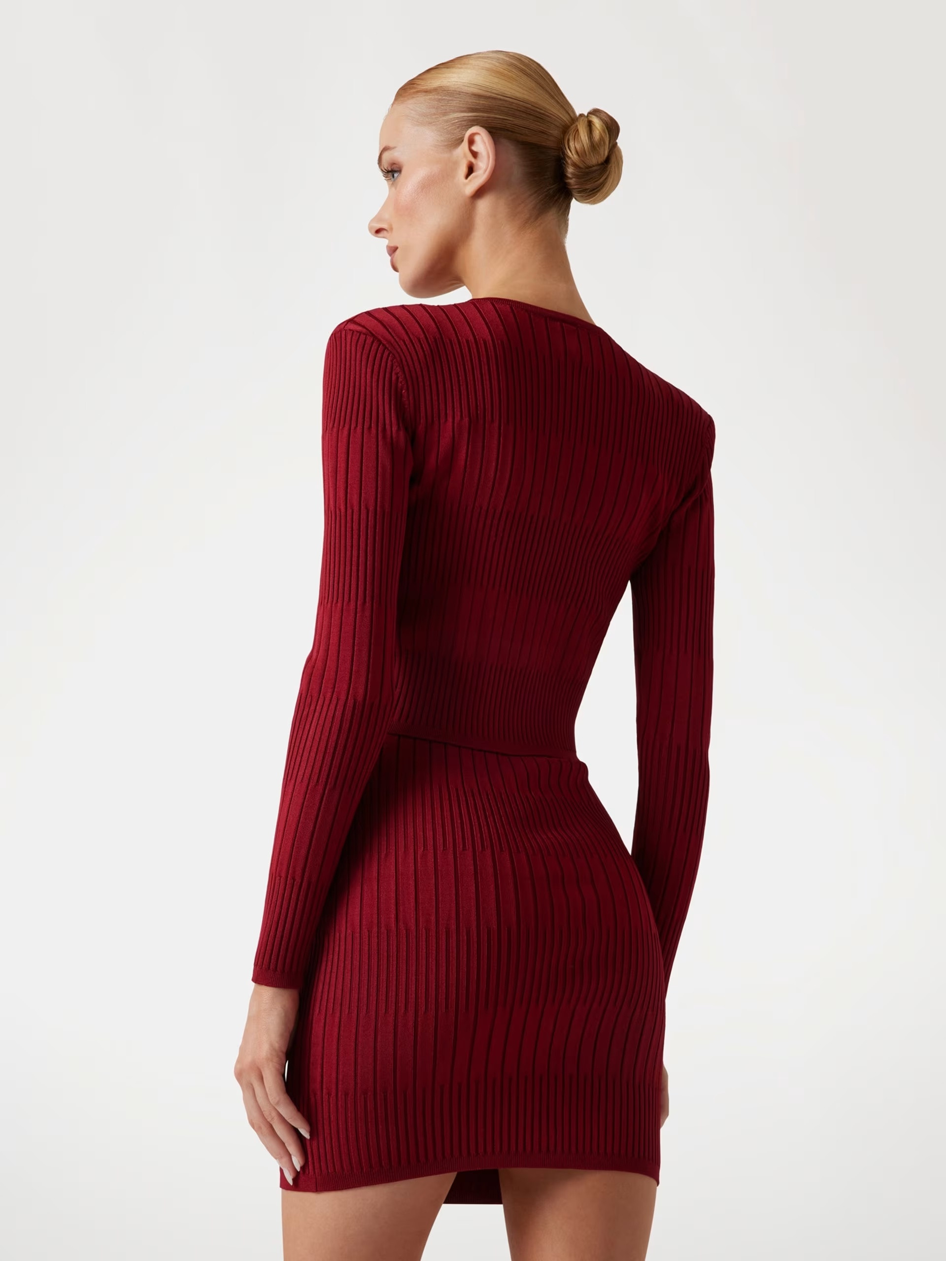 Awaken your charm with this stretch viscose-blend cropped cardigan. The classic rounded neckline and sleek long sleeves offer timeless elegance. Vertical ribbing throughout creates a chic effect, complemented by the luxurious jeweled button fastening. Perfect for elevating evening attire or a stylish work ensemble.