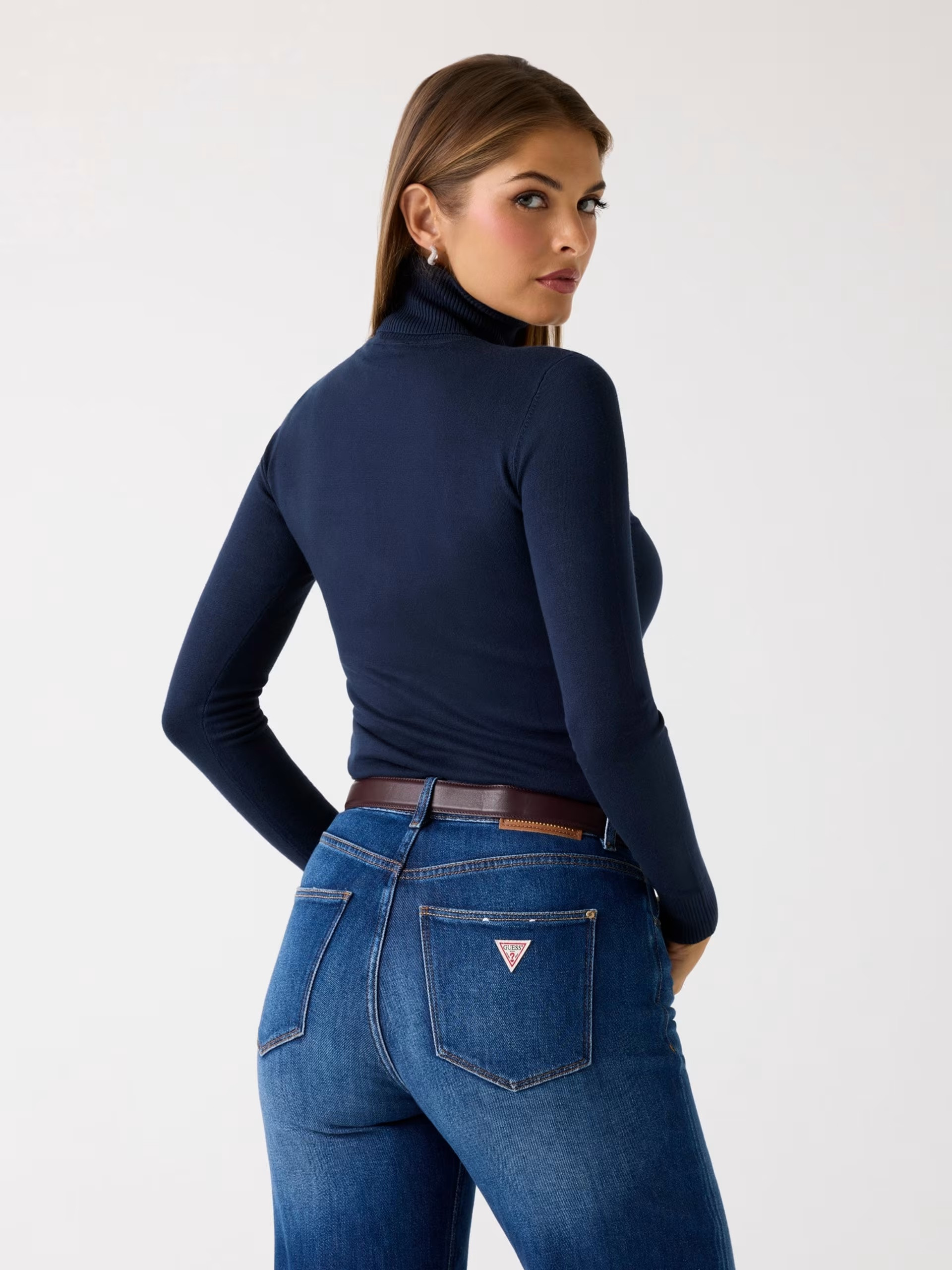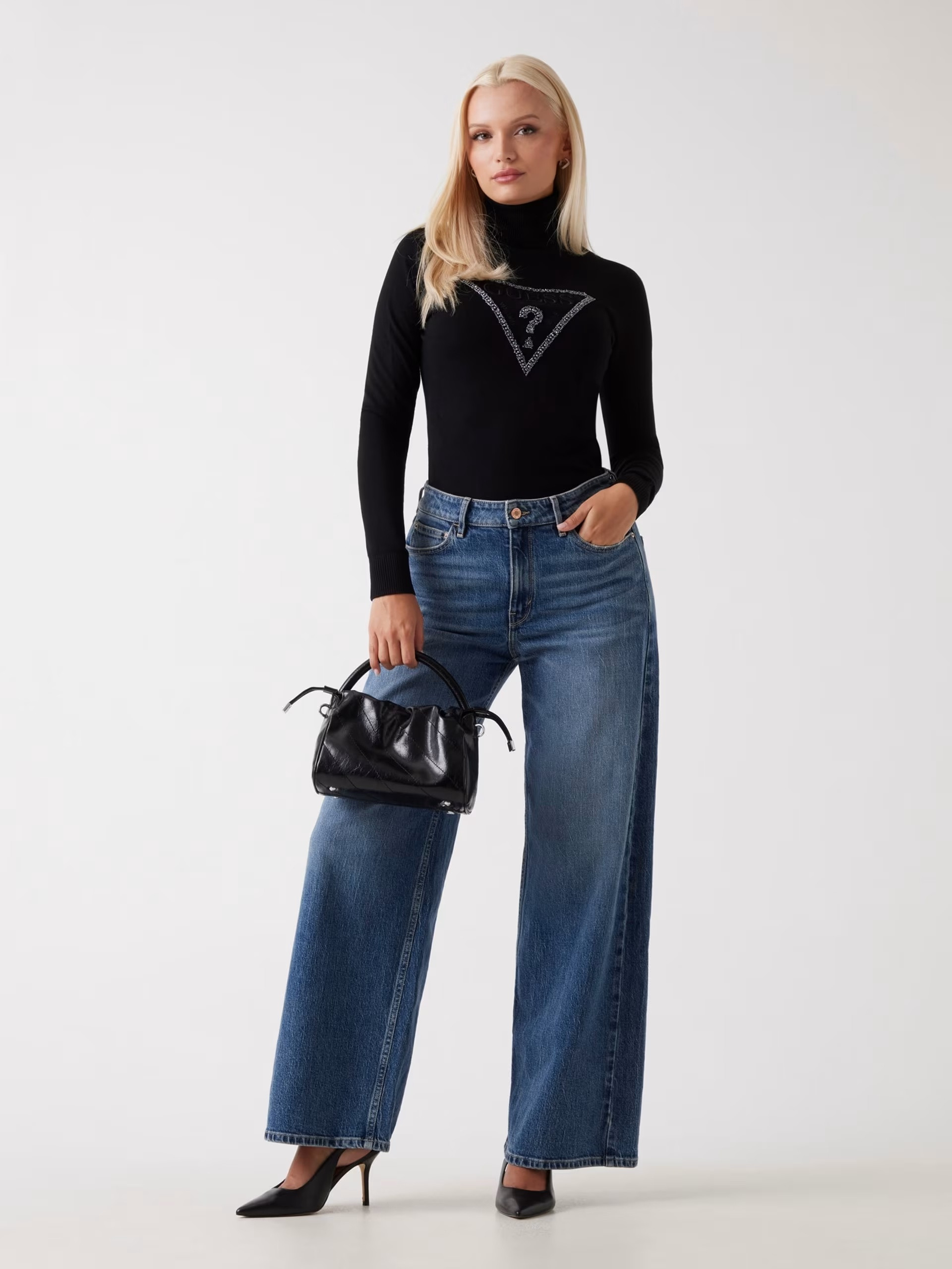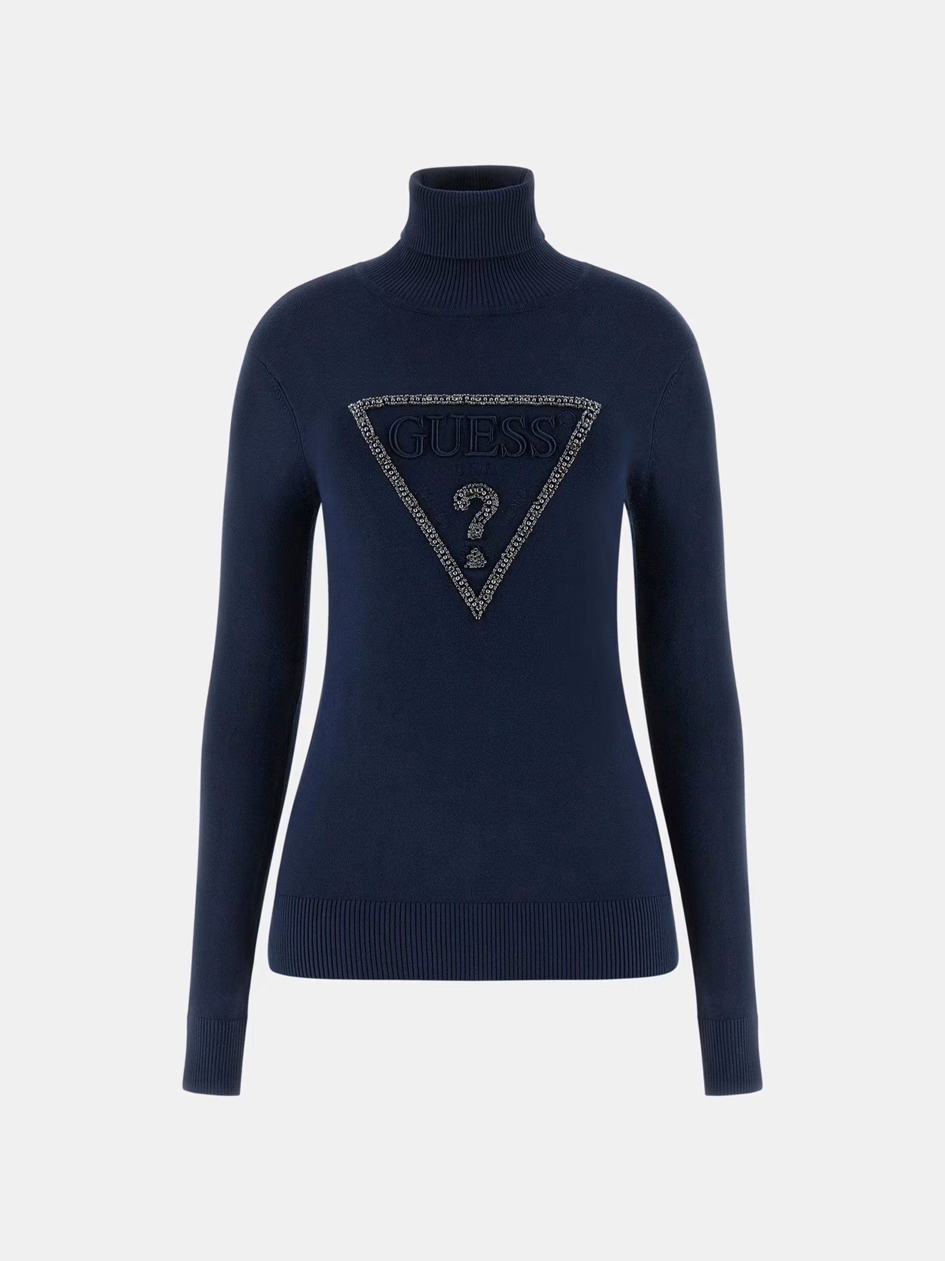 Step into comfort and style with this stretch viscose-blend sweater. The rib-knit turtle neck and oversized triangle logo elevate your look. Adorned with bead embellishments, perfect for city outings. Crafted from LENZING™ ECOVERO™, environmentally friendly.