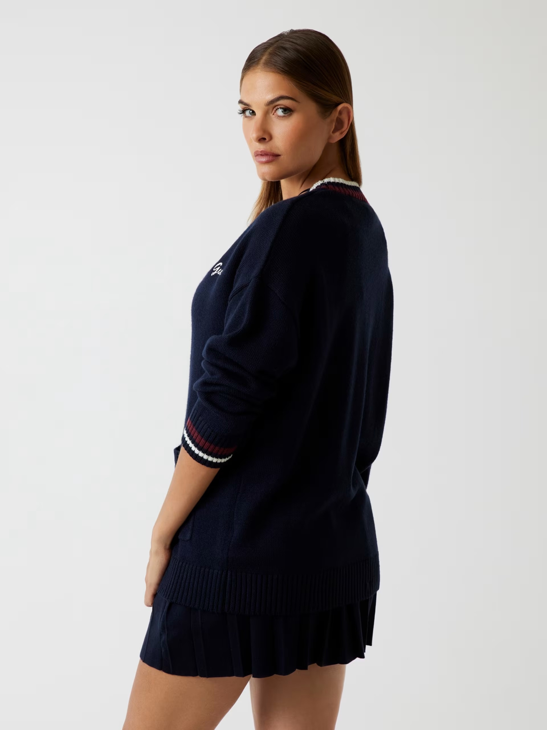 • Striped trim on the cuffs, placket and V-neck.