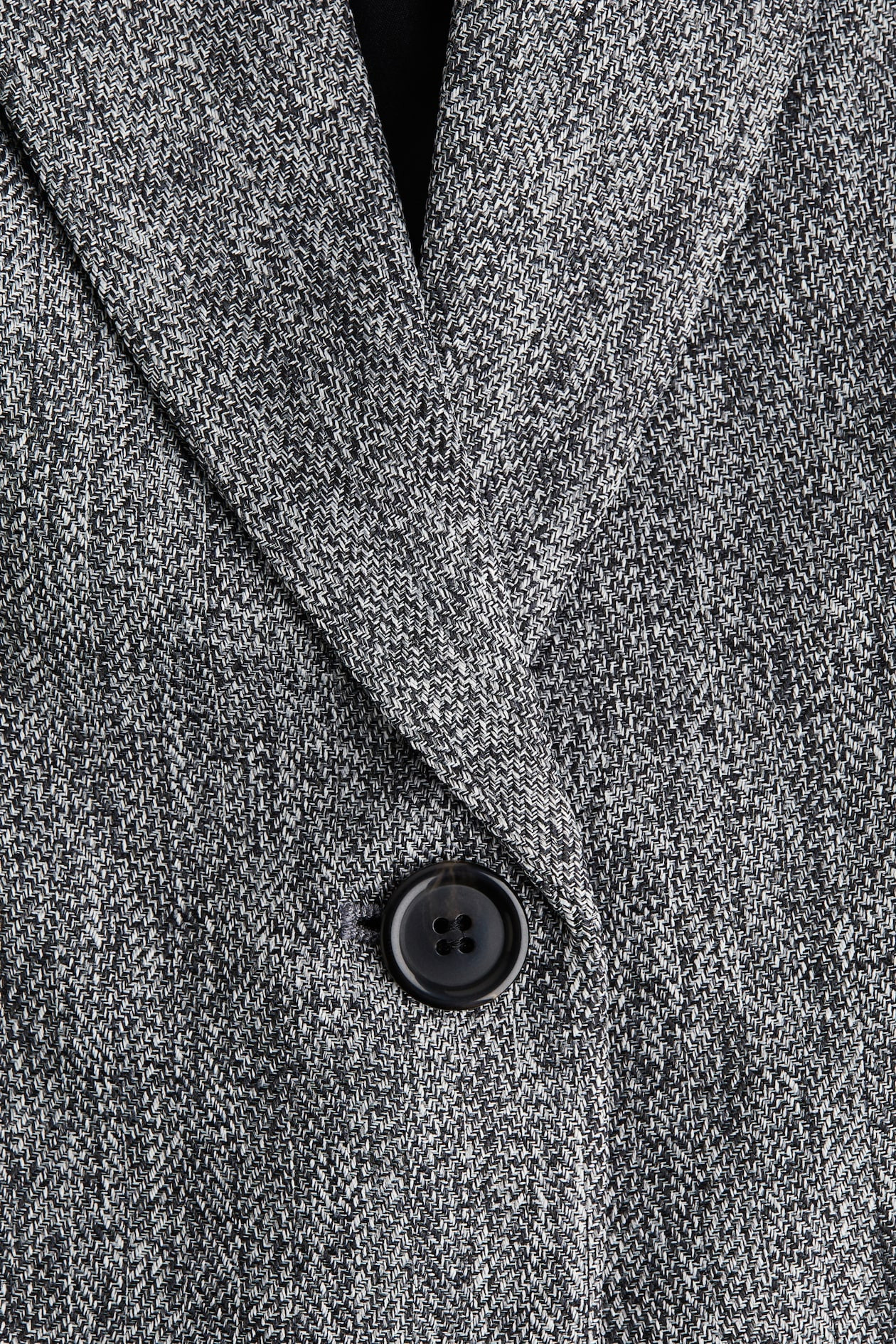 Long blazer in woven fabric with a lapel collar, one-button front closure, waist darts, and welt pockets. Padded shoulders and gathered 3/4-length sleeves. Lined.