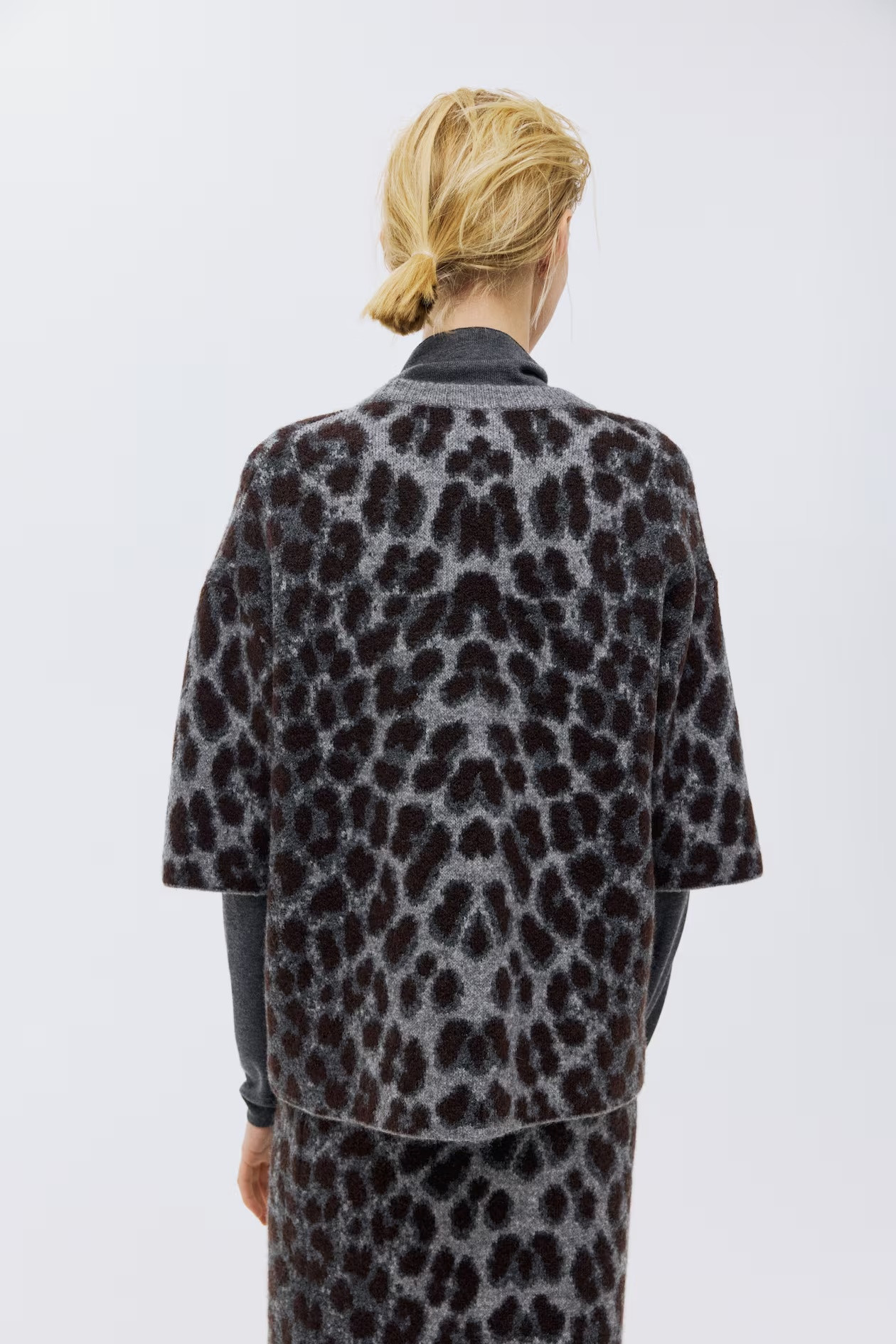 Boxy sweater in soft jacquard knit with a ribbed round neck, dropped shoulders, and elbow-length sleeves. Loose fit.