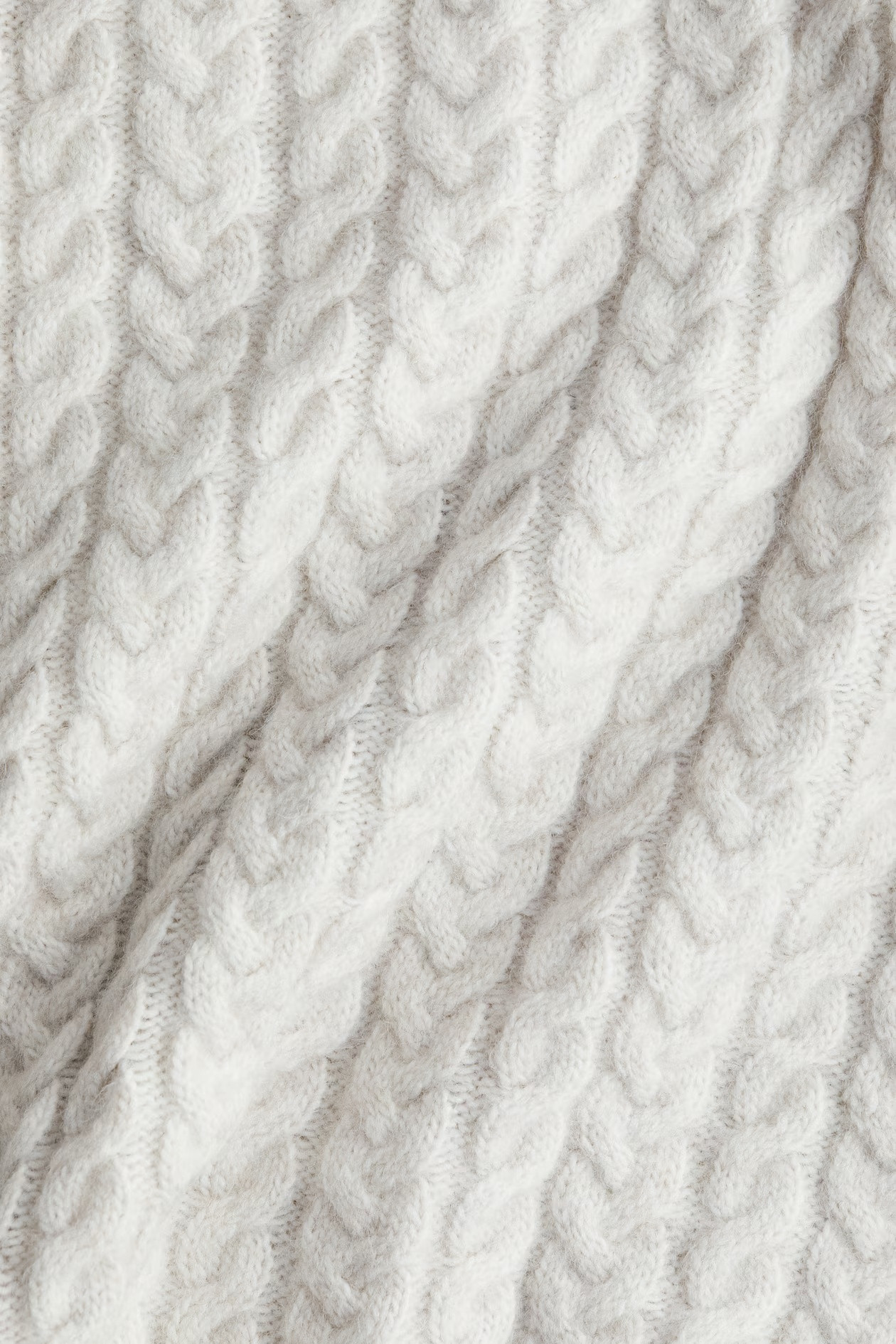 Soft cable knit sweater with a ribbed round neck, dropped shoulders, and narrow ribbed cuffs and hem.
