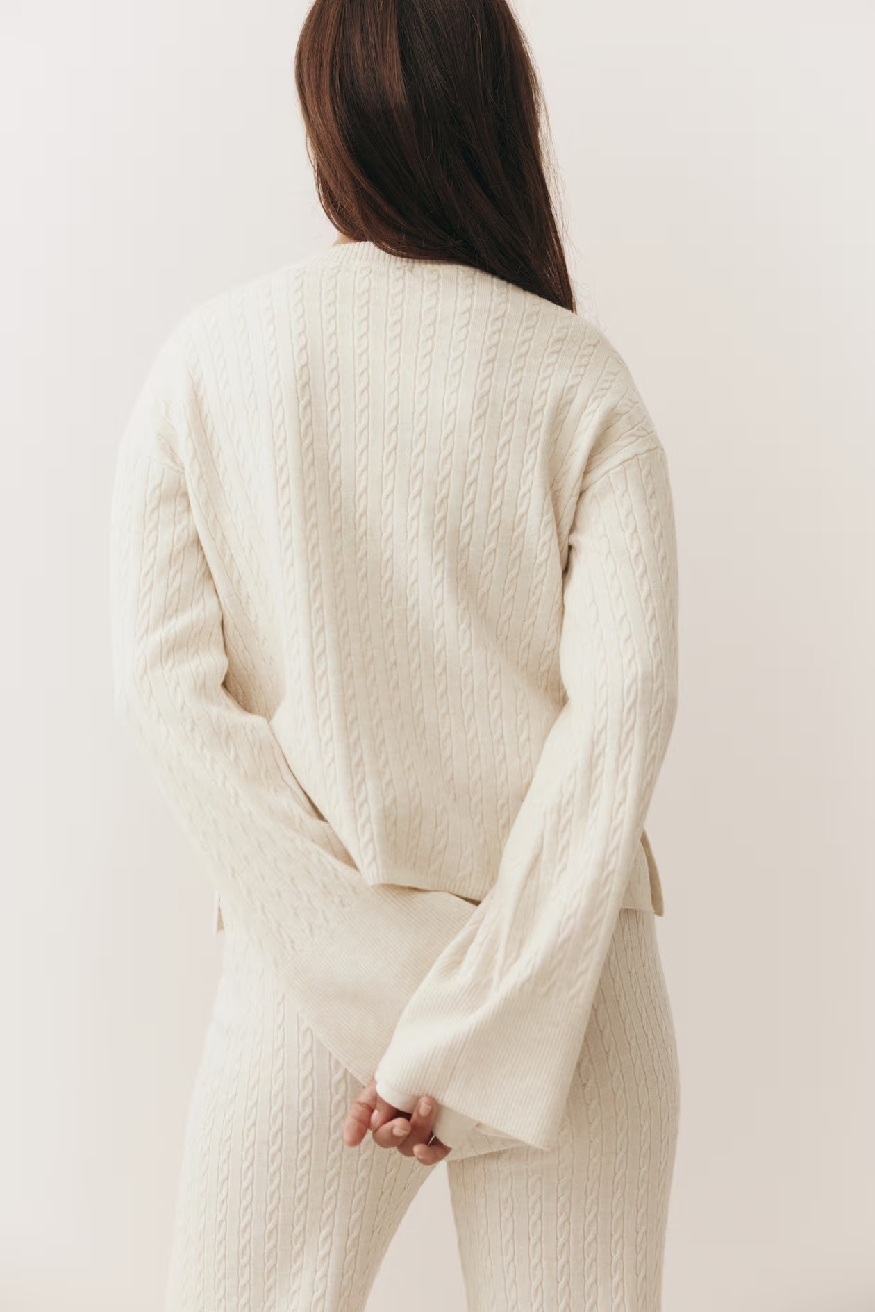 Sweater made of soft cable knit with a touch of wool. Ribbed round neck, dropped shoulders, and long, wide sleeves with ribbed cuffs. Straight hem with side slits.