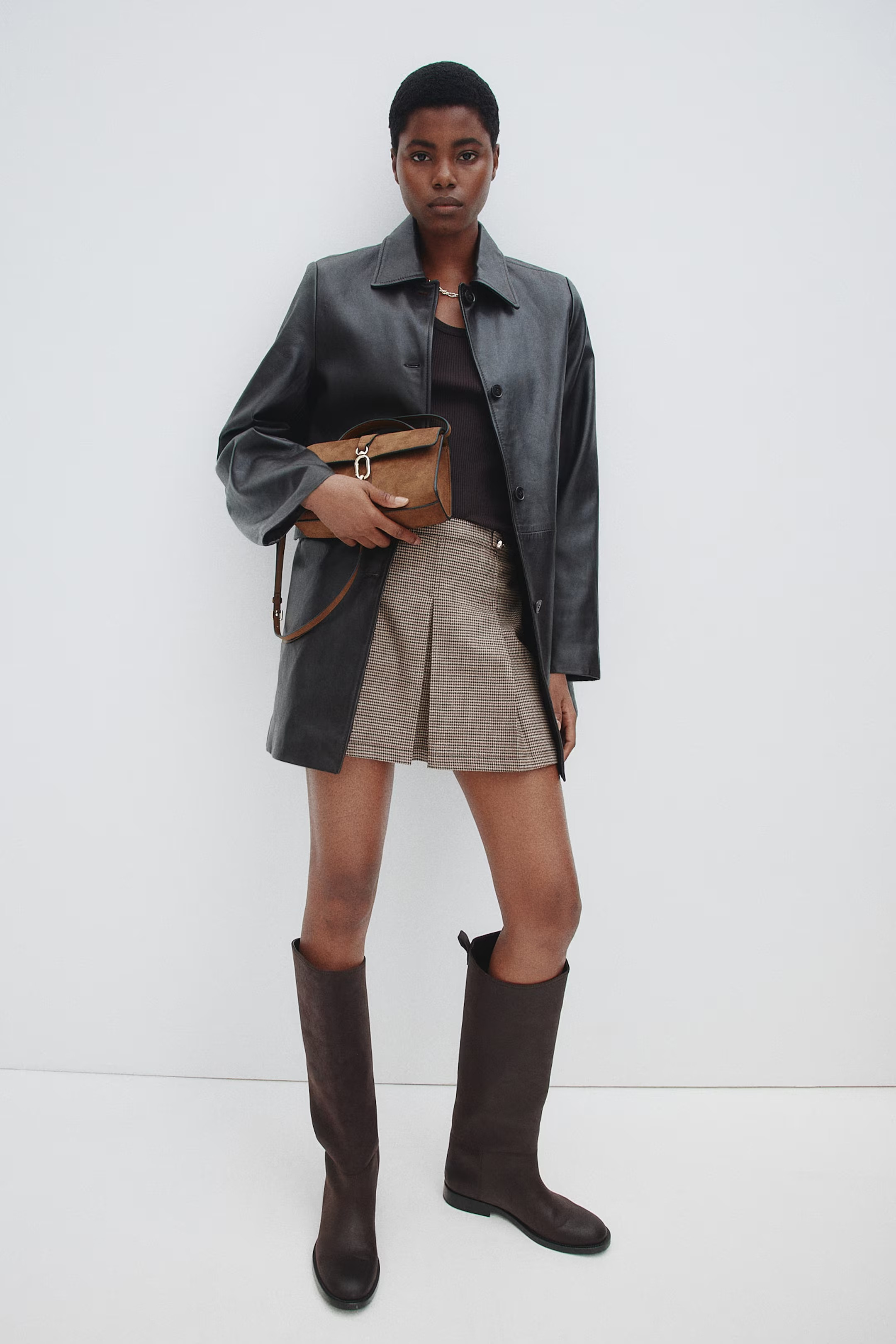 Crossbody bag with a soft, napped finish featuring a handle and an adjustable shoulder strap with a metal buckle. Flap with an oval carabiner hook at the front. Lined. Depth 5 cm. Height 15 cm. Width 22 cm.