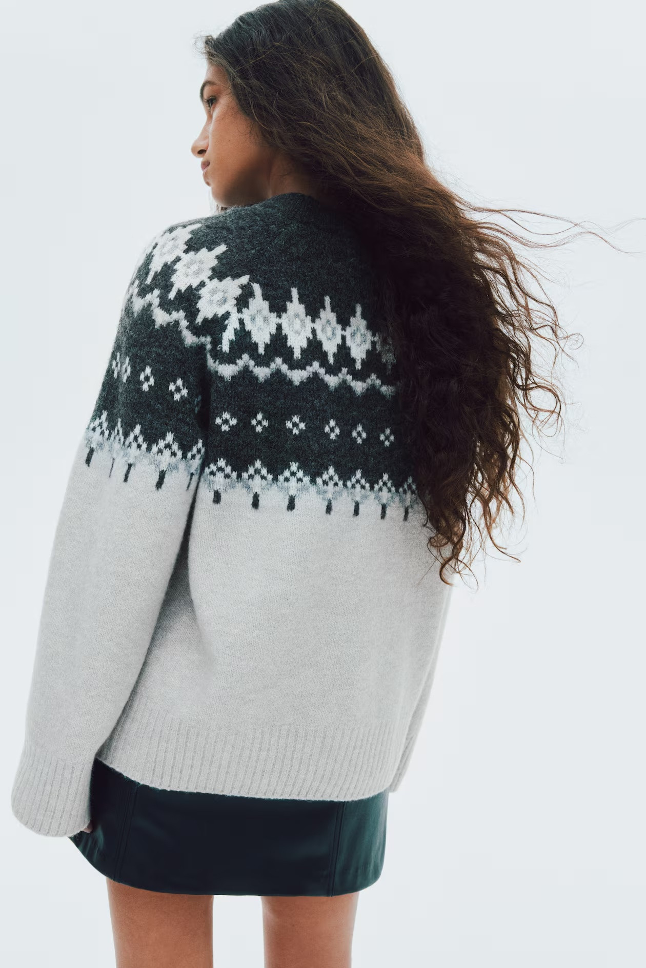 Oversized sweater made of soft jacquard knit with wool. Featuring a ribbed round neck, long raglan sleeves, and ribbed cuffs and hem.