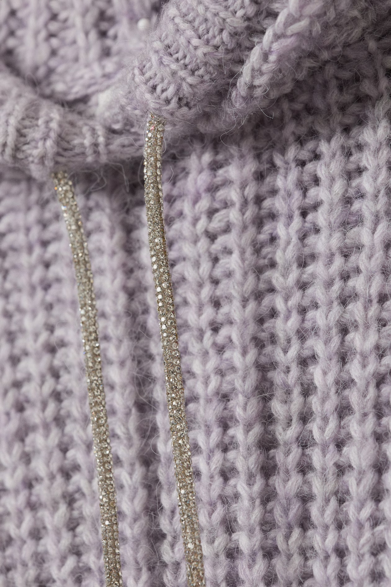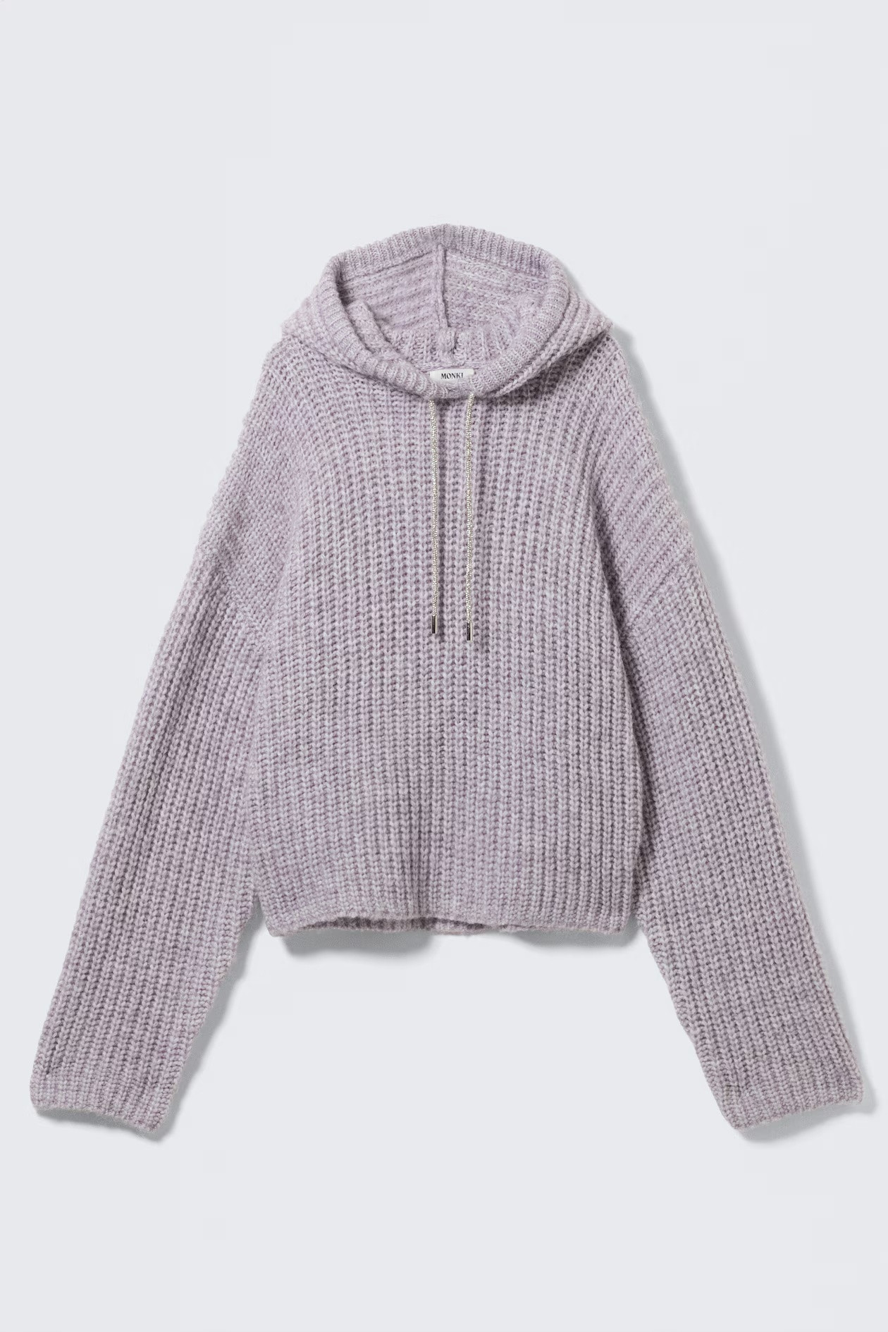 A knitted hoodie with a soft, textured feel. Crafted from chunky half-rib knit, it features a generous hood, ribbed trim, and rhinestone drawstrings.