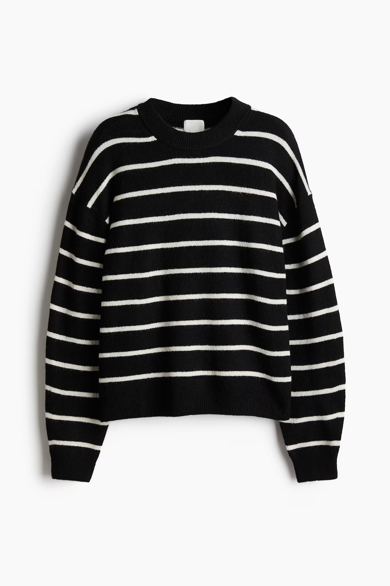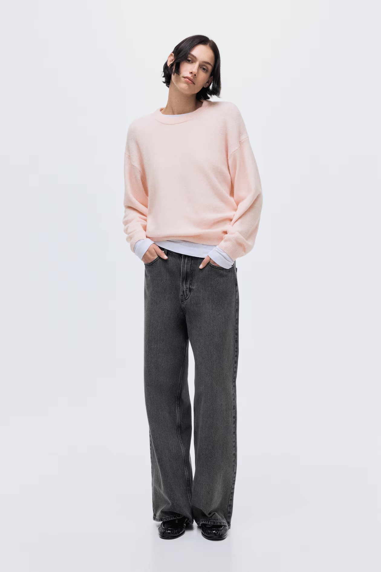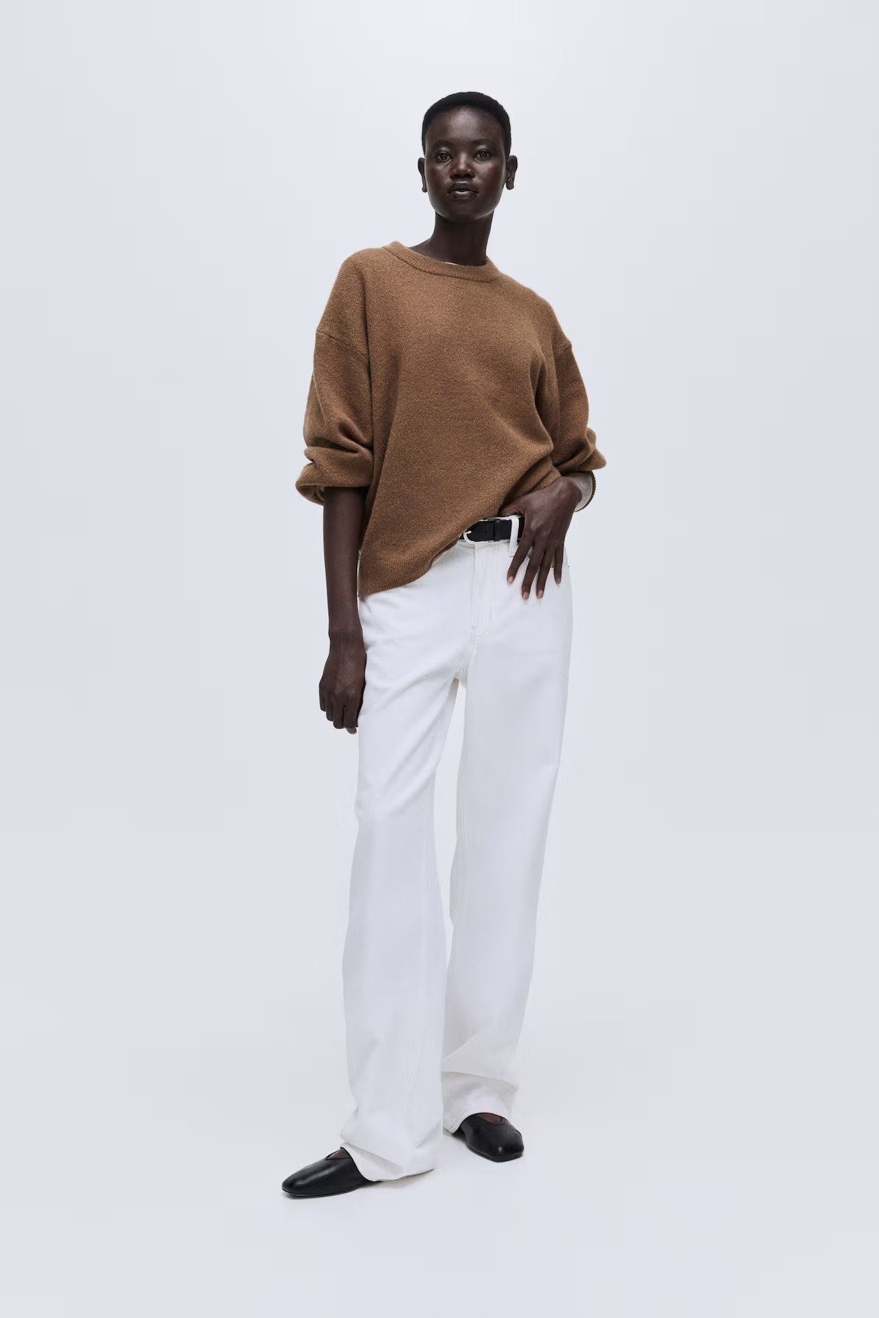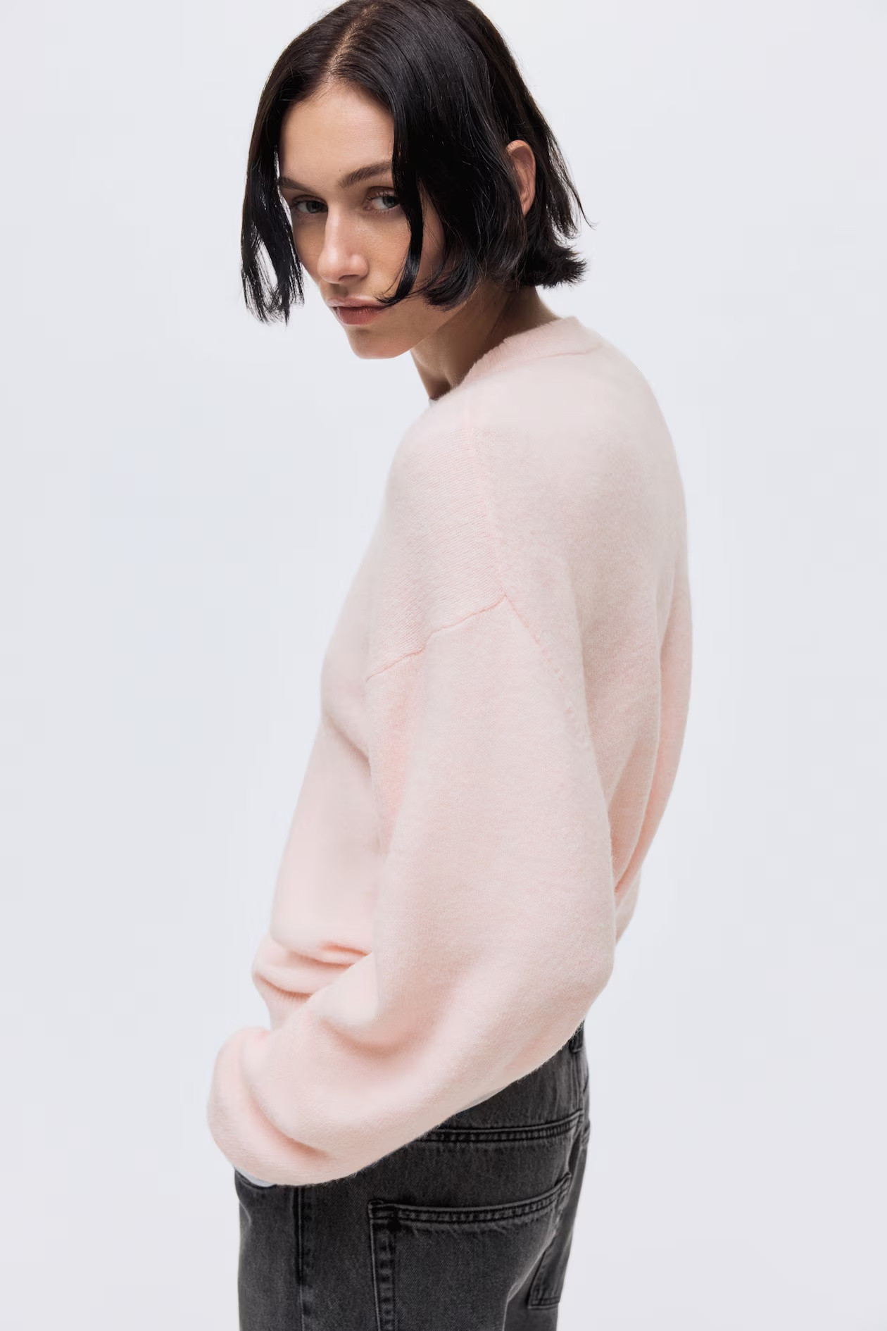 Sweater made of soft knit with a touch of wool. It features a ribbed round neck, dropped shoulders, and ribbed cuffs and hem.