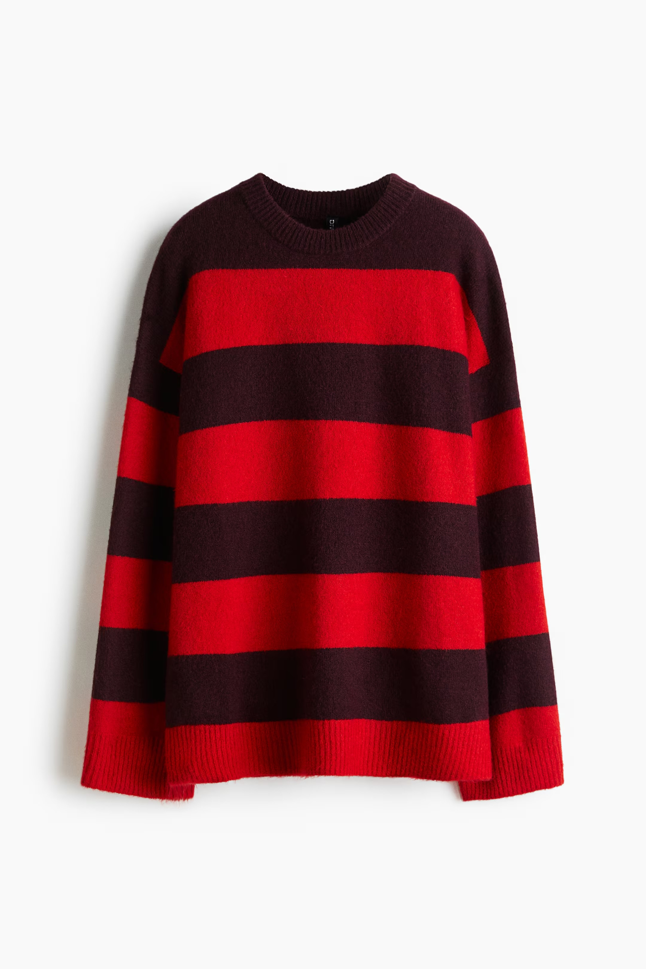 A loosely fitting sweater made from soft knit fabric with a wool blend. Features a round neck, dropped shoulders, and ribbed cuffs and hem.