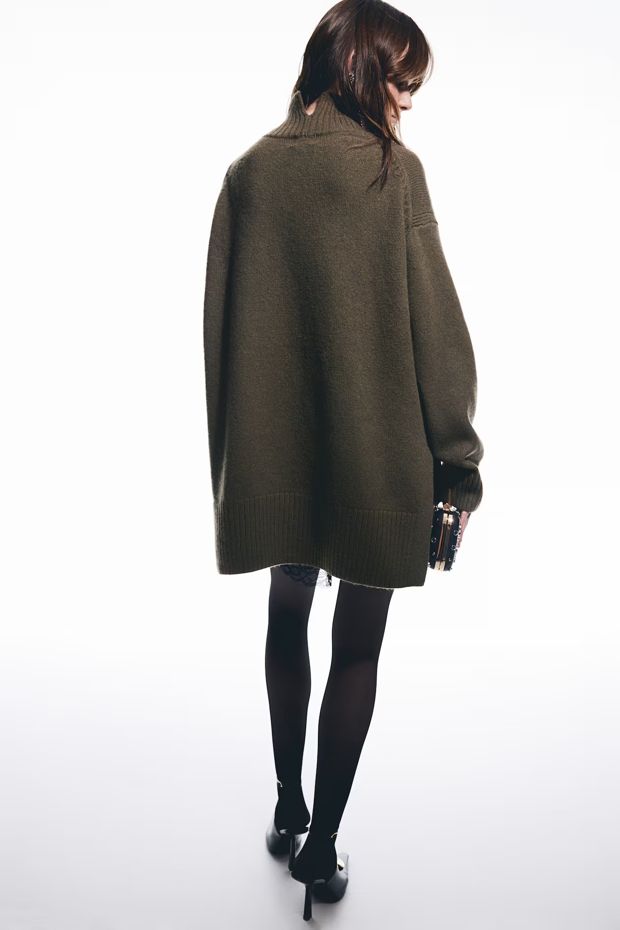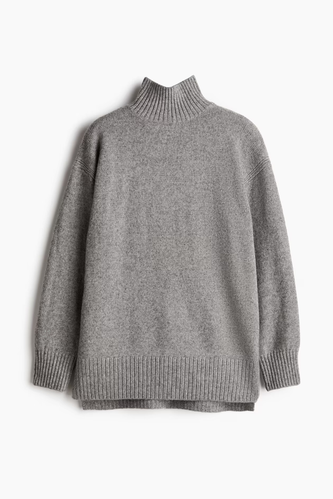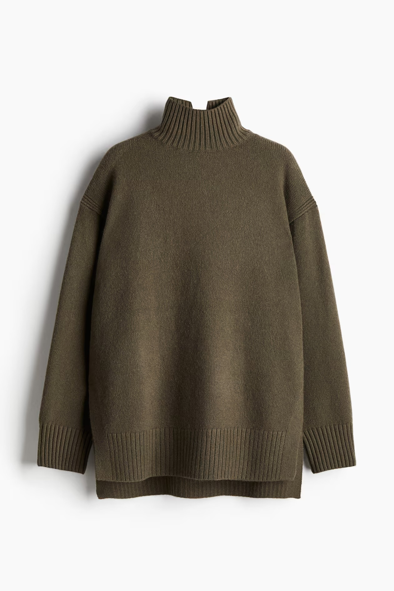 Oversized sweater made of a soft knit with a touch of wool. It features a ribbed turtleneck and a V-neck opening. Dropped shoulders, long, wide sleeves, and ribbed cuffs and hem. High side slits.