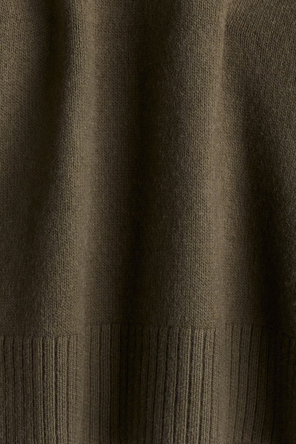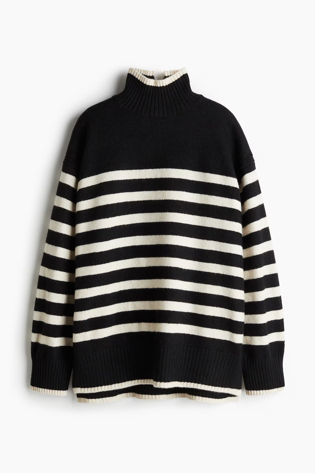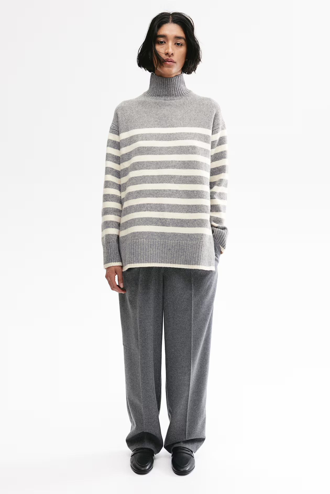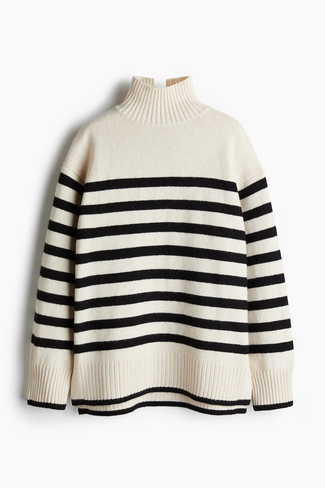 Oversized sweater made of a soft knit with a touch of wool. It features a ribbed turtleneck and a V-neck opening. Dropped shoulders, long, wide sleeves, and ribbed cuffs and hem. High side slits.