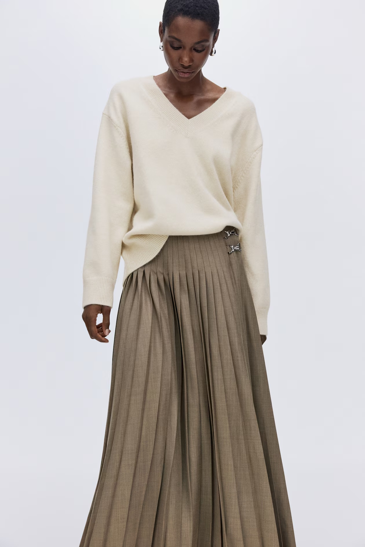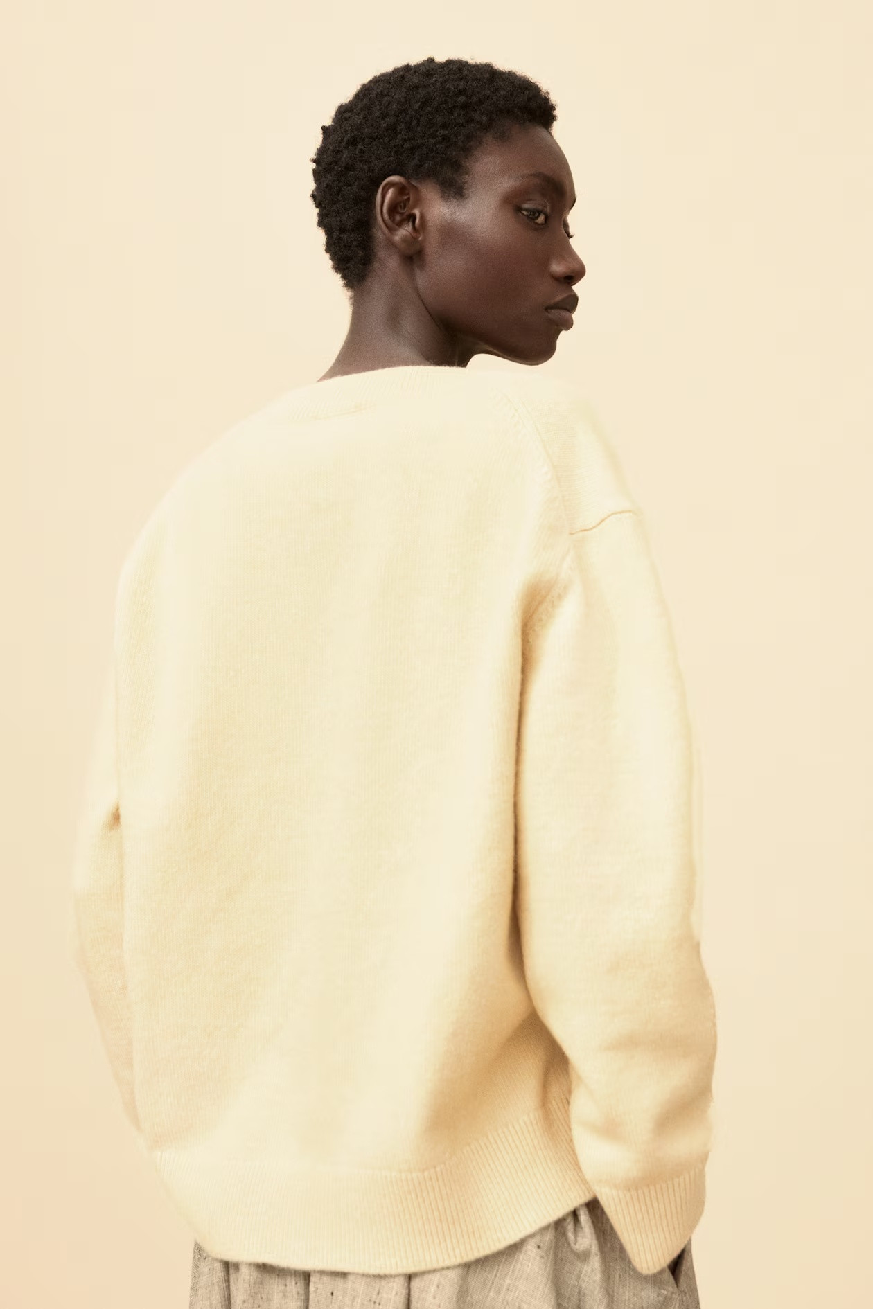 Oversized sweater made of soft knit. Featuring a V-neck, dropped shoulders, and long sleeves. Ribbed cuffs at the neckline, cuffs, and hem.